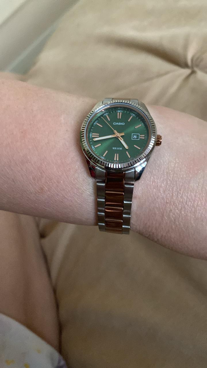 Японские женские часы Casio Collection LTP-1302PRG-3AVEF с минеральным стекломМинеральное стеклоМинеральное стекло представляет собой искусственно выращенный минерал кварца. Такое стекло отличается особой устойчивостью к повреждениям и царапинам. Уступает по некоторым качествам сапфировому стеклу.. Светящееся покрытие обеспечивает длительную подсветку в темное время суток после короткого воздействия света. Корпус выполнен из гипоаллергенной латуни. Модель комплектуется надёжным механизмом, точность хода которого составляет +/- 20 сек/мес. Стрелки с люминесцентным покрытиемЛюминесцентное покрытиеПозволяет считывать показания времени в темноте. Производители наносят на стрелки, часовые индексы, безель или поверхность циферблата светонакопительный состав, дающий холодное свечение.. Стальной браслет на раскладной застёжкеРаскладная застёжкаТакой тип застёжки используется только на браслетах из металла. Она никогда не раскрывается полностью, происходит разделение на 2 и более частей. Раскладывающая застёжка снизит вероятность потери часов к минимуму. с IP-покрытиемIP-покрытиеМетод ионного напыления. Демонстрирует повышенную устойчивость к истиранию, окислению и химическим веществам. Под воздействием высокого давления и температуры около 1500°C молекулы металла надёжно соединяются с частицами корпуса часов.. Окошко даты находится в положении 3 часа. Водонепроницаемость  50 метров, позволит защитить корпус от случайных брызг или капель дождя.