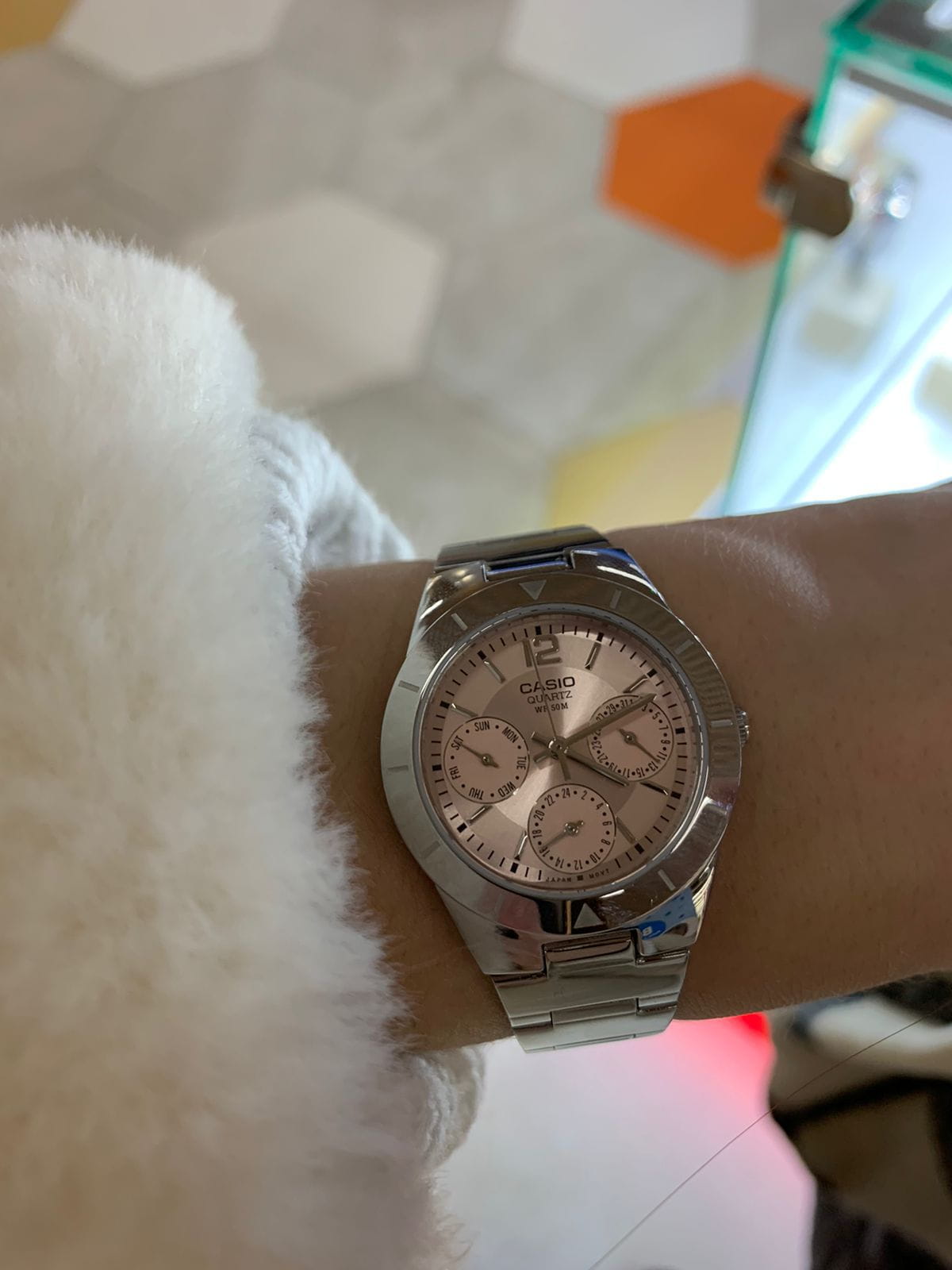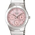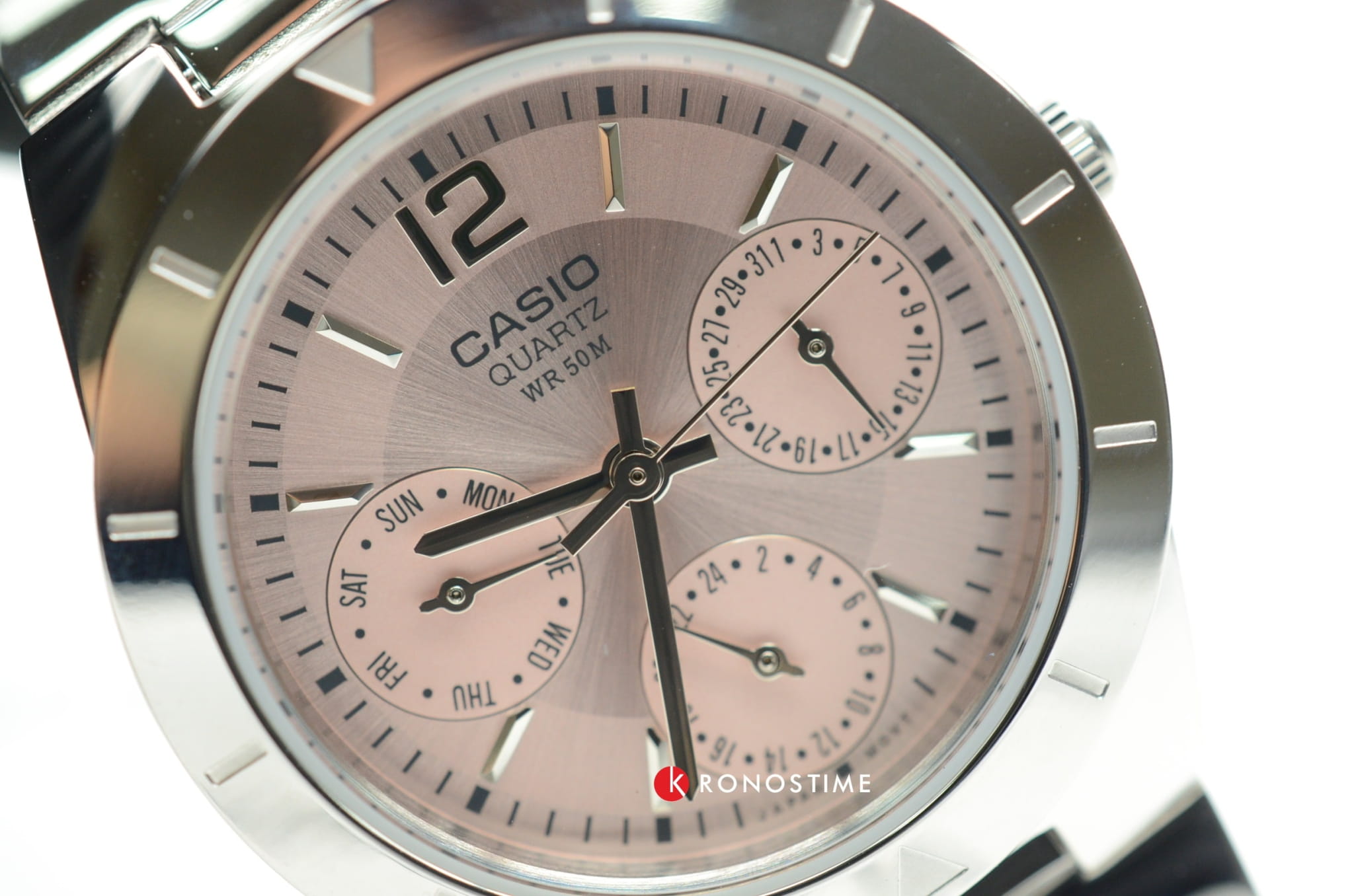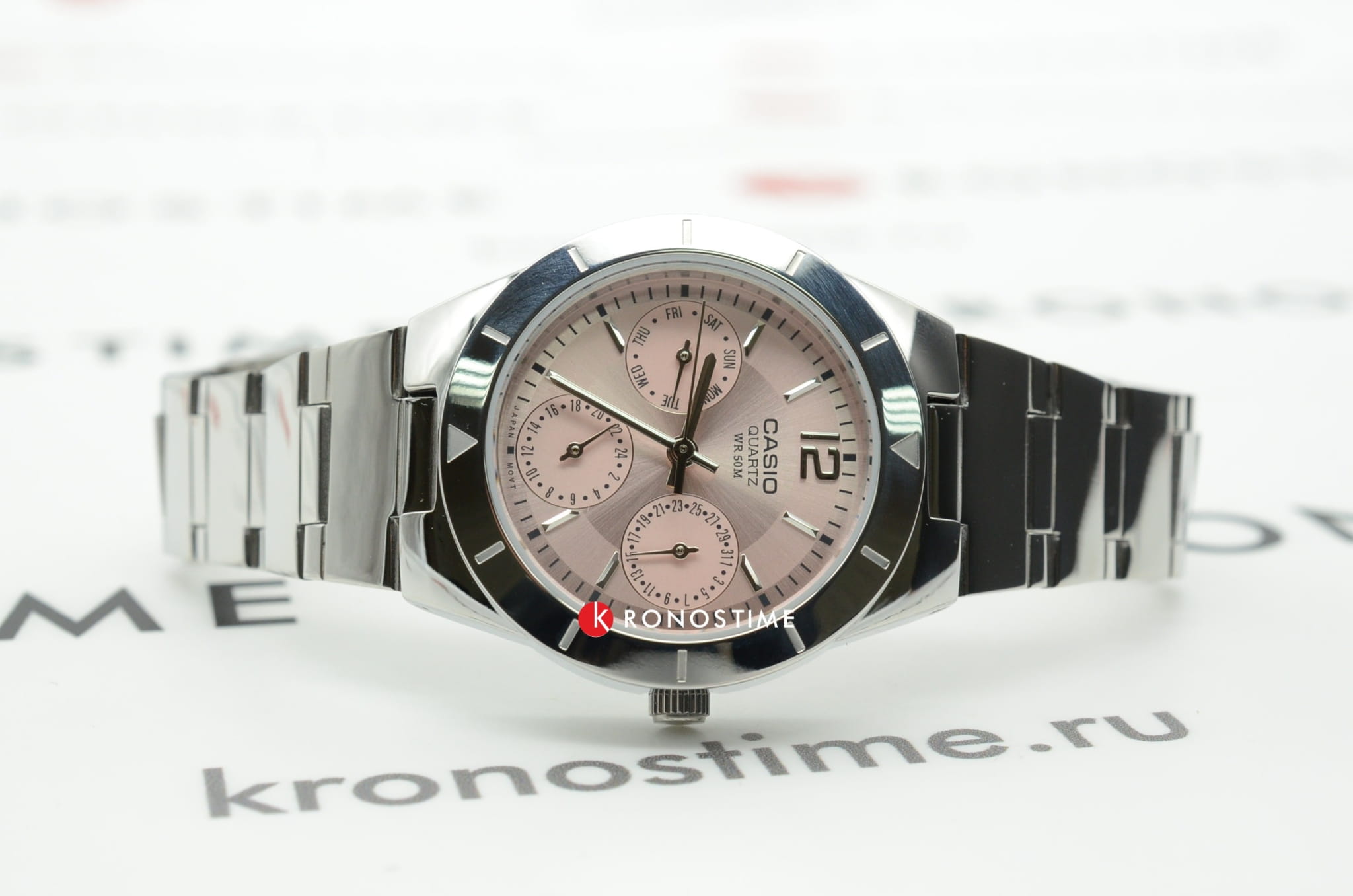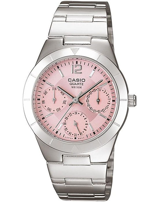 Практичные наручные часы от Casio обладают неповторимым, привлекательным дизайном. Аккуратный корпус и браслет, состоящий из нескольких звеньев, сделаны из нержавеющей стали и прочно соединены между собой. На циферблате светло-розового цвета расположены временные отметки в виде штрихов и арабских цифр. На дисплее отображаются текущая дата и день недели. Кварцевые часы работают от батарейки, срок службы которой составляет 3 года. Водонепроницаемость равна 50 WR.
