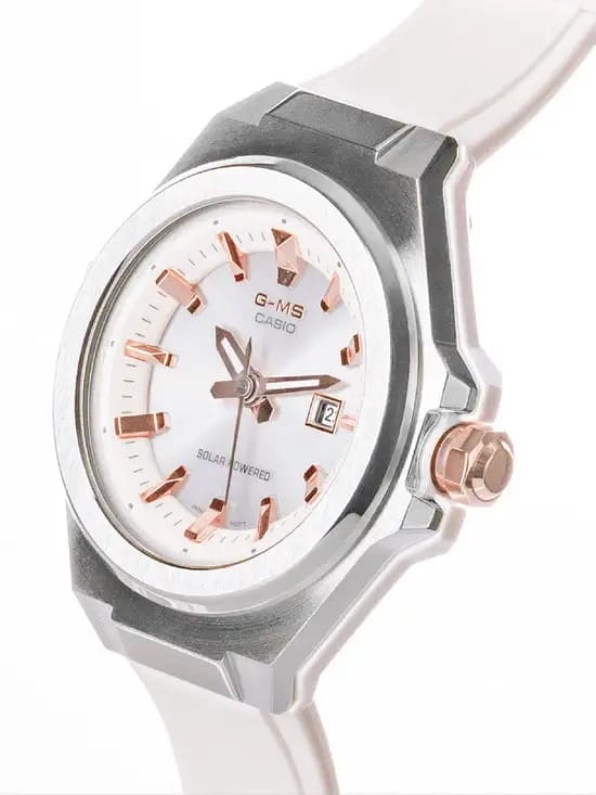 Женские японские часы Casio Baby-G MSG-S500-7AER из коллекции Baby-G стали отражением спортивного дизайна с элементами в стиле fashion. Модель сочетает несколько вариаций розового: металлизированные стрелки, индексы, заводная головка, пастельный оттенок полимерного ремешка. Такое исполнение поможет девушкам, ведущим активный образ жизни, не забывать о своей женственной натуре. Наручные часы реализуют технологию Tough SolarTough SolarТехнология основана на подзарядке аккумулятора от источника солнечного света, специальная панель улавливает солнечные лучи и преобразует их в энергию для работы часов. Достаточно пары минут нахождения на солнце для функционирования часов в течении суток., получая питание от солнца и искусственных источников света. При полностью зараженной батарейке японский кварцевый механизм способен проработать до 5 месяцев без подзарядки. Противоударный корпусУдаропрочный корпусМеханизм заключён в корпус, выполненный из современных материалов, устойчивых к ударам, механическим повреждениям и падению с высоты: инновационный пластик, карбон, нержавеющая сталь, титан. сделан из полимерного материала и нержавеющей стали 316L, что позволяет не бояться последствий ударов, падения. Циферблат оснащён минеральным стекломМинеральное стеклоМинеральное стекло представляет собой искусственно выращенный минерал кварца. Такое стекло отличается особой устойчивостью к повреждениям и царапинам. Уступает по некоторым качествам сапфировому стеклу., оно отличается прочностью, устойчивостью к образованию царапин. Завинчивающаяся заводная головка способствует усилению водостойкости до 10 бар. Стрелки покрыты светонакопительным люминесцентным составомЛюминесцентное покрытиеПозволяет считывать показания времени в темноте. Производители наносят на стрелки, часовые индексы, безель или поверхность циферблата светонакопительный состав, дающий холодное свечение.. На позиции 3 часов размещена апертура текущего числа. Габариты: 38,8 x 42,4 x 10,5 мм.