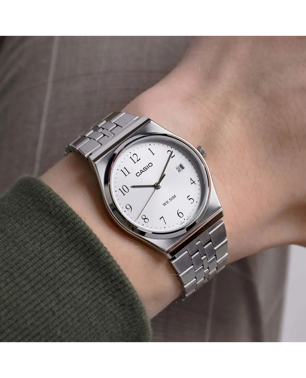 Японские мужские часы с минеральным стекломМинеральное стеклоМинеральное стекло представляет собой искусственно выращенный минерал кварца. Такое стекло отличается особой устойчивостью к повреждениям и царапинам. Уступает по некоторым качествам сапфировому стеклу. Casio Collection MTP-B145D-7B, кварцевый механизм с высокой точностью. Корпус часов изготовлен из стали. Циферблат выполнен по технологии Sunray (солнечные лучи). Метки в виде арабских цифр. Окошко даты находится в положении 3 часа. Батарейка рассчитана на 3 года. Класс водозащиты: 50 метров, позволит защитить корпус от случайных брызг или капель дождя. Стальной браслет на раскладной застёжкеРаскладная застёжкаТакой тип застёжки используется только на браслетах из металла. Она никогда не раскрывается полностью, происходит разделение на 2 и более частей. Раскладывающая застёжка снизит вероятность потери часов к минимуму..