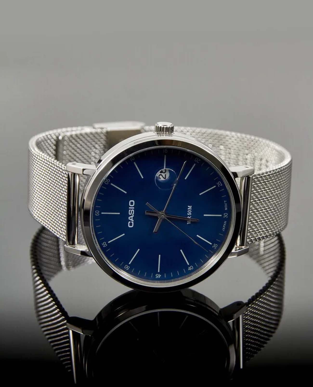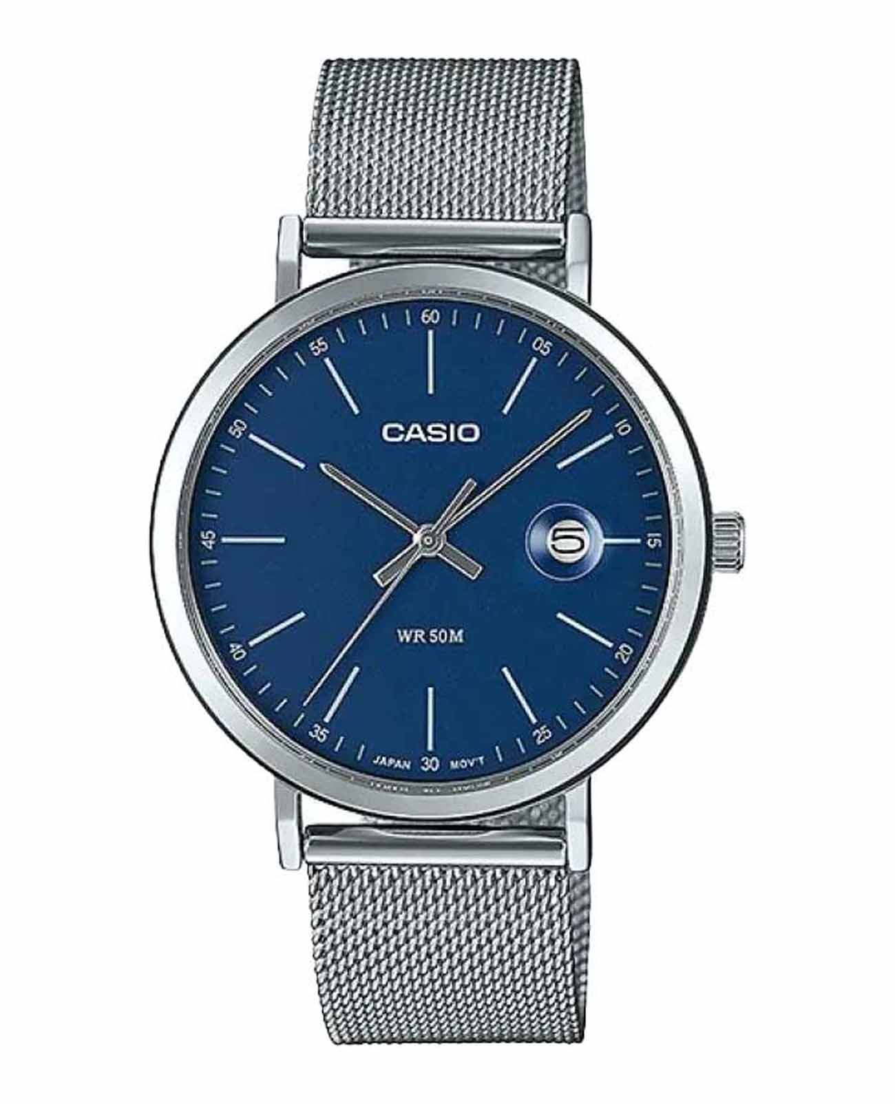 Японские мужские часы с минеральным стекломМинеральное стеклоМинеральное стекло представляет собой искусственно выращенный минерал кварца. Такое стекло отличается особой устойчивостью к повреждениям и царапинам. Уступает по некоторым качествам сапфировому стеклу. Casio Collection MTP-E175MB-2E, кварцевый механизм с высокой точностью. Корпус часов изготовлен из стали.  Циферблат с метками в виде штрихов. Окошко даты находится в положении 3 часа. Рифленая заводная головка. Класс водозащиты: 50 метров, позволит защитить корпус от случайных брызг или капель дождя. Стальной браслет миланского плетения на раскладном замкеРаскладной замокДанный вариант застежки используется только на часах с металлическим браслетом. Отличительная особенность такого крепления в том, что длина браслета становится универсальной и вы можете самостоятельно отрегулировать нужный вам размер – застежка просто двигается по браслету часов..