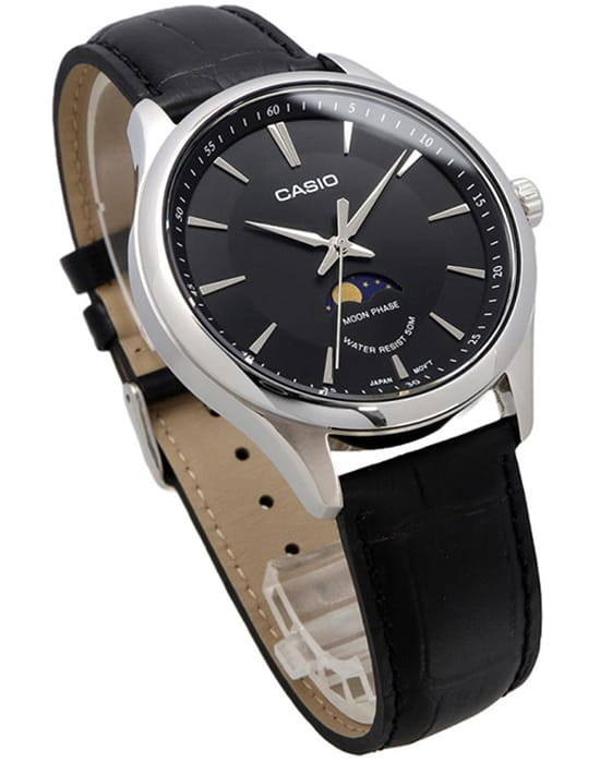 Японские мужские часы с минеральным стекломМинеральное стеклоМинеральное стекло представляет собой искусственно выращенный минерал кварца. Такое стекло отличается особой устойчивостью к повреждениям и царапинам. Уступает по некоторым качествам сапфировому стеклу. Casio Collection MTP-M110L-1A, кварцевый механизм с высокой точностью. Изысканный корпус часов изготовлен из стали серебристого цвета, что обеспечивает долговечность и утончённый внешний вид. Циферблат с метками в виде арабских цифр с отображением фаз Луны в положении 6 часов. Заводная головка с защитой. Батарейка рассчитана на 3 года. Класс водозащиты: 50 метров, позволит защитить корпус от случайных брызг или капель дождя. Изысканный кожаный ремешок на стандартной застёжке гармонично дополняет корпус и обеспечивает комфортное ношение. Эти часы подойдут для повседневного ношения и станут ярким акцентом в вашем наряде.