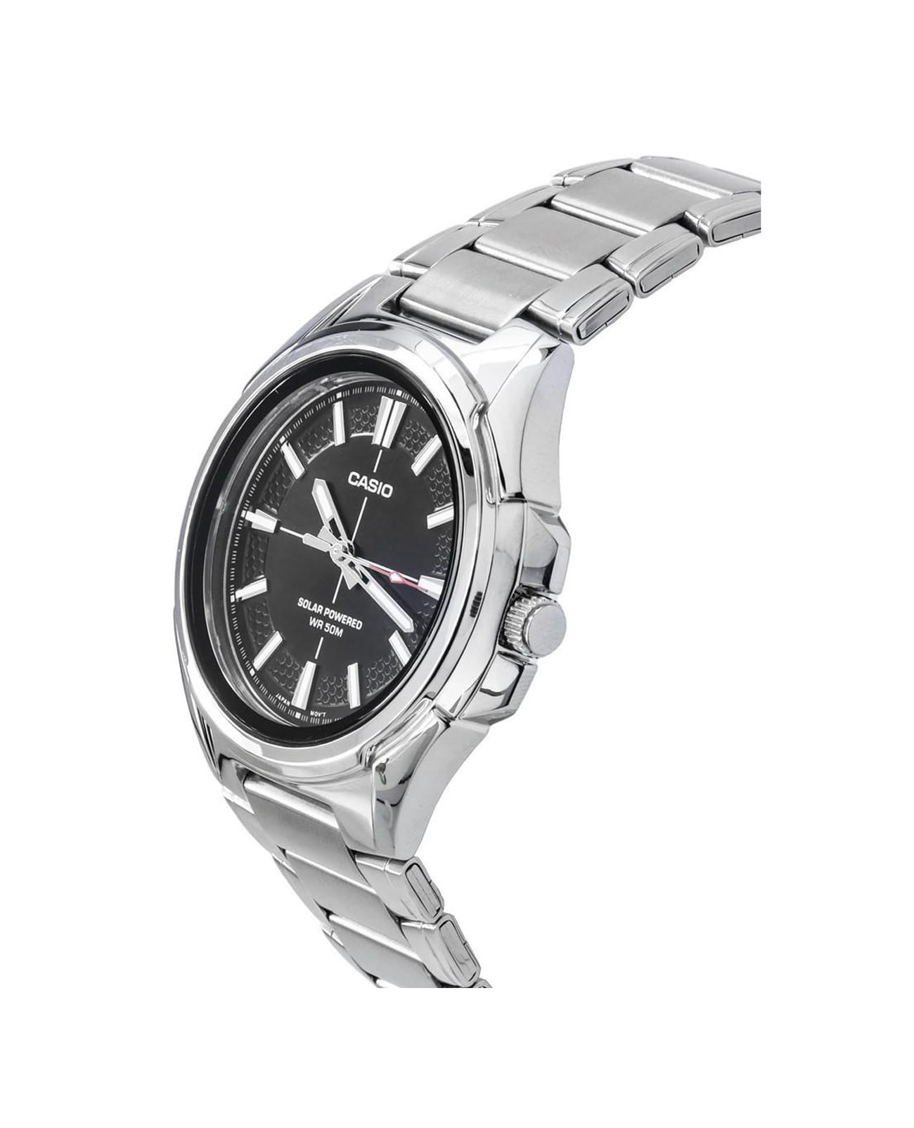 Японские мужские кварцевые часы с минеральным стекломМинеральное стеклоМинеральное стекло представляет собой искусственно выращенный минерал кварца. Такое стекло отличается особой устойчивостью к повреждениям и царапинам. Уступает по некоторым качествам сапфировому стеклу. Casio Collection MTP-RS100D-1A, кварцевый механизм с высокой точностью. Корпус часов изготовлен из нержавеющей стали. Питание от солнечной энергии. Время работы - 4 месяца. Циферблат с метками в виде штрихов выполнен по технологии Sunray (солнечные лучи). Циферблат с метками в виде штрихов. Стрелки и метки с люминесцентным покрытиемЛюминесцентное покрытиеПозволяет считывать показания времени в темноте. Производители наносят на стрелки, часовые индексы, безель или поверхность циферблата светонакопительный состав, дающий холодное свечение.. Заводная головка с защитой. Класс водозащиты: 50 метров, позволит защитить корпус от случайных брызг или капель дождя. Стальной браслет на раскладной застёжкеРаскладная застёжкаТакой тип застёжки используется только на браслетах из металла. Она никогда не раскрывается полностью, происходит разделение на 2 и более частей. Раскладывающая застёжка снизит вероятность потери часов к минимуму..