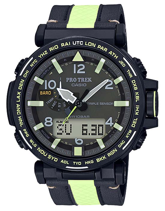 Японские мужские часы-хронографХронографФункция позволяет измерять отрезки времени с особой точностью: часы, минуты, секунды. Верным признаком хронографа является наличие на циферблате 3 дополнительных окошек-счётчиков. Casio Pro Trek PRG-650YL-3DR. Минеральное стеклоМинеральное стеклоМинеральное стекло представляет собой искусственно выращенный минерал кварца. Такое стекло отличается особой устойчивостью к повреждениям и царапинам. Уступает по некоторым качествам сапфировому стеклу. устойчивое к появлению царапин, обладающее высокой прозрачностью. Pro Trek представляет новые камуфляжные вариации для многофункциональных и спортивных часов. Triple Sensor - General-Purpose Line. Питание от солнечной энергии Tough SolarTough SolarТехнология основана на подзарядке аккумулятора от источника солнечного света, специальная панель улавливает солнечные лучи и преобразует их в энергию для работы часов. Достаточно пары минут нахождения на солнце для функционирования часов в течении суток. - солнечные батарейки большой мощности, индикатор заряда батареи. Функция автоматического сохранения энергии. Время работы аккумулятора без подзарядки приблизительно 8 месяцев, при включенной функции сохранения энергии приблизительно 23 месяца. Модуль часов рассчитан на работу при низких температурах до -10°С/14°F. Корпус часовы выполенен из пластика и стали с IP-покрытиемIP-покрытиеМетод ионного напыления. Демонстрирует повышенную устойчивость к истиранию, окислению и химическим веществам. Под воздействием высокого давления и температуры около 1500°C молекулы металла надёжно соединяются с частицами корпуса часов.. Циферблат подсвечивается ярким светодиодомСветодиодная подсветкаСветодиодная или LED-подсветка обеспечивает появление яркого холодного свечения за счёт LED-элементов - маленьких лампочек. Они потребляют минимальное количество энергии, чаще всего можно встретить 1 светодиод, в нижней части циферблата., при недостаточном освещении во время поворота запястья в сторону лица подсветка включается автоматически.  Мировое времяМировое время Полезное часовое усложнение, отображающее время в основных городах и известных областях по всему миру, оно связано с часовыми поясами, удобно для путешественников и бизнесменов. – 48 городов (29 часовых поясов), всемирное координированное время (UTC). Функция включения/отключения летнего времени. 12-ти и 24-х часовой формат времени. Время восхода и захода Солнца. Технология Triple Sensor позволяет точно и легко определять сторону света, температуру и атмосферное давление. Термометр от -10° до +60°С с точностью 0,1°C. Барометр - измерение атмосферного давления от 260 до 1100 гПа (от 195 до 825 мм рт. ст.). Встроенный цифровой компас. Диапазон измерения от 0° до 359° с точностью 1°. Высотомер - встроенный датчик барометрического давления с возможностью вывода результатов в единицах высоты над уровнем моря (от -700 до 10000 метров). СекундомерСекундомерСекундоме́р — прибор, способный измерять интервалы времени с точностью до долей секунды. с точностью измерения 1/100 секунды и измерением до 23 часов 59 минут 59,99 cек. ТаймерТаймерОтсчитывает секунды в обратном направлении в заданном интервале времени. обратного отсчета (диапазон времени 24 часа), автоматический календарь, 12/24 отображение времени. 5 будильниковБудильникБуди́льник — часы, в заданный момент времени подающи