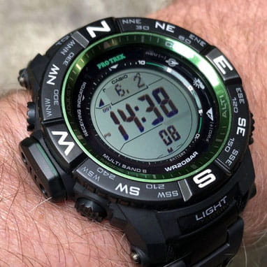 Описание часов Casio Protrek PRW-3510FC-1 - многофункциональные японские мужские наручные часы. Круглый корпус часов выполнен из темного пластика, безель из стали, резиновый браслет. Инверсионный, жидкокристаллический дисплей. Часы оснащены такими дополнительными функциями как cекундомерСекундомерСекундоме́р — прибор, способный измерять интервалы времени с точностью до долей секунды., таймерТаймерОтсчитывает секунды в обратном направлении в заданном интервале времени., высотометр, термометр, компас, альтиметр. Минеральное стеклоМинеральное стеклоМинеральное стекло представляет собой искусственно выращенный минерал кварца. Такое стекло отличается особой устойчивостью к повреждениям и царапинам. Уступает по некоторым качествам сапфировому стеклу. устойчивое к мелким механическим повреждениям. Магнитоустойчивая, ударопрочная модель. Источником энергии служат солнечные батареи Tough SolarTough SolarТехнология основана на подзарядке аккумулятора от источника солнечного света, специальная панель улавливает солнечные лучи и преобразует их в энергию для работы часов. Достаточно пары минут нахождения на солнце для функционирования часов в течении суток.. Синхронизация времени по радиосигналу.