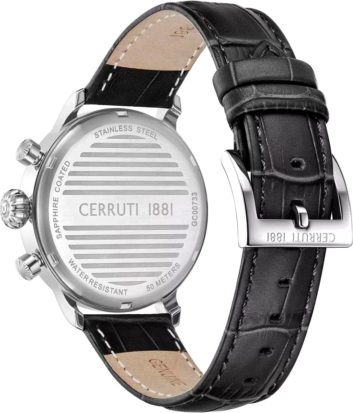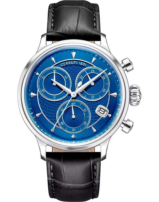 Cerruti 1881 CIWGC0073303 — элегантные мужские часы, сочетающие классическую форму корпуса с выразительной спортивной функциональностью. На рельефном циферблате расположены три дополнительных индикатора хронографаХронографФункция позволяет измерять отрезки времени с особой точностью: часы, минуты, секунды. Верным признаком хронографа является наличие на циферблате 3 дополнительных окошек-счётчиков. и окошко даты в положении «4 часа». Корпус из нержавеющей стали подчёркивает солидность модели, а контрастные акценты на стрелках и метках придают ей изысканный характер. Стекло минеральноеМинеральное стеклоМинеральное стекло представляет собой искусственно выращенный минерал кварца. Такое стекло отличается особой устойчивостью к повреждениям и царапинам. Уступает по некоторым качествам сапфировому стеклу. обеспечивает надёжную защиту от царапин. Кожаный ремешок с классической прострочкой дополняет образ и фиксируется удобной стандартной застежкой. Эта модель удачно объединяет традиционную утончённость и современную энергию, подойдя как к деловому, так и повседневному стилю.