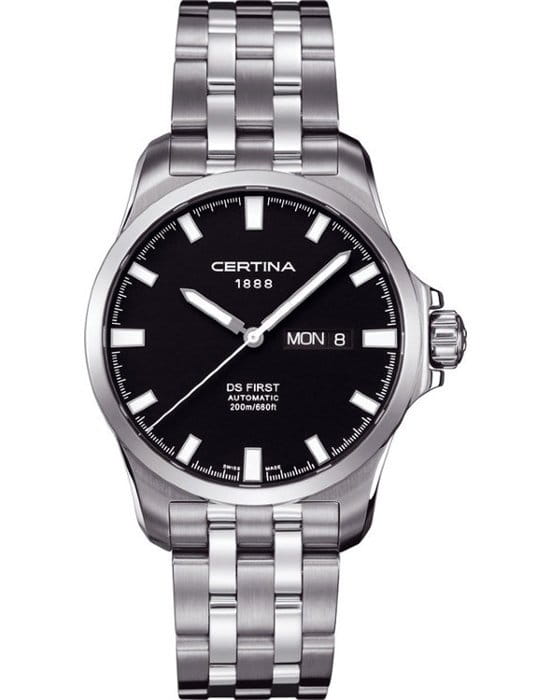 CERTINA C014.407.11.051.00 DS First Automatic - мужские механические наручные часы. Корпус этих часов среднего размера (40 мм) и выполнен из нержавеющей стали L316 металлического цвета. Модель CERTINA C014.407.11.051.00 DS First Automatic имеет устойчивое к царапинам сапфировое стекло, браслет из нержавающей стали металлического цвета, черный циферблат. Калибр механизма: ETA 2836-2. Класс водозащиты: 200 м / 20 АТМ (разрешается нырять с аквалангом на глубину). Дополнительные функции и особенности: отображение числа. Полная заводская комплектация CERTINA: оригинальные часы, фирменная коробка, инструкция, сервисная книжка, кассовый и товарный чеки. Международная гарантия 2 года. Производство и сборка: Швейцария