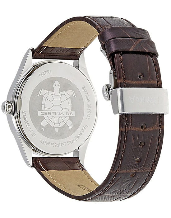 Классический циферблат белого цвета дополнен золотистыми стрелками, ярко выделяющимися на общем фоне. Коричневый ремешок из натуральной кожи с тиснением, имитирующим кожу крокодила, позволит привнести в образ нотки элегантности. Кварцевый калибр ETA E64.111. Антибликовое покрытие сапфирового стекла. Надёжный корпус из нержавеющей стали 316L. Яркая люминесцентная подсветкаЛюминесцентное покрытиеПозволяет считывать показания времени в темноте. Производители наносят на стрелки, часовые индексы, безель или поверхность циферблата светонакопительный состав, дающий холодное свечение.. Концепция ударопрочности DS Concept DS ConceptDouble Security Concept, обозначает двойную надёжность и безупречную точность часов Certina. Двойная система защиты подразумевает обеспечение максимальной устойчивости к ударам и высоких показателей водонепроницаемости.. Водостойкость 100 метров. Апертура даты, индикатор EOLEOLПредставляет собой систему, уведомляющую владельца часов о необходимости замены элемента питания. За 2 недели до полного разряда батарейки секундная стрелка перестаёт ходить чётко и начинает перепрыгивать на 3-4 деления.. Диаметр корпуса: 37 мм.