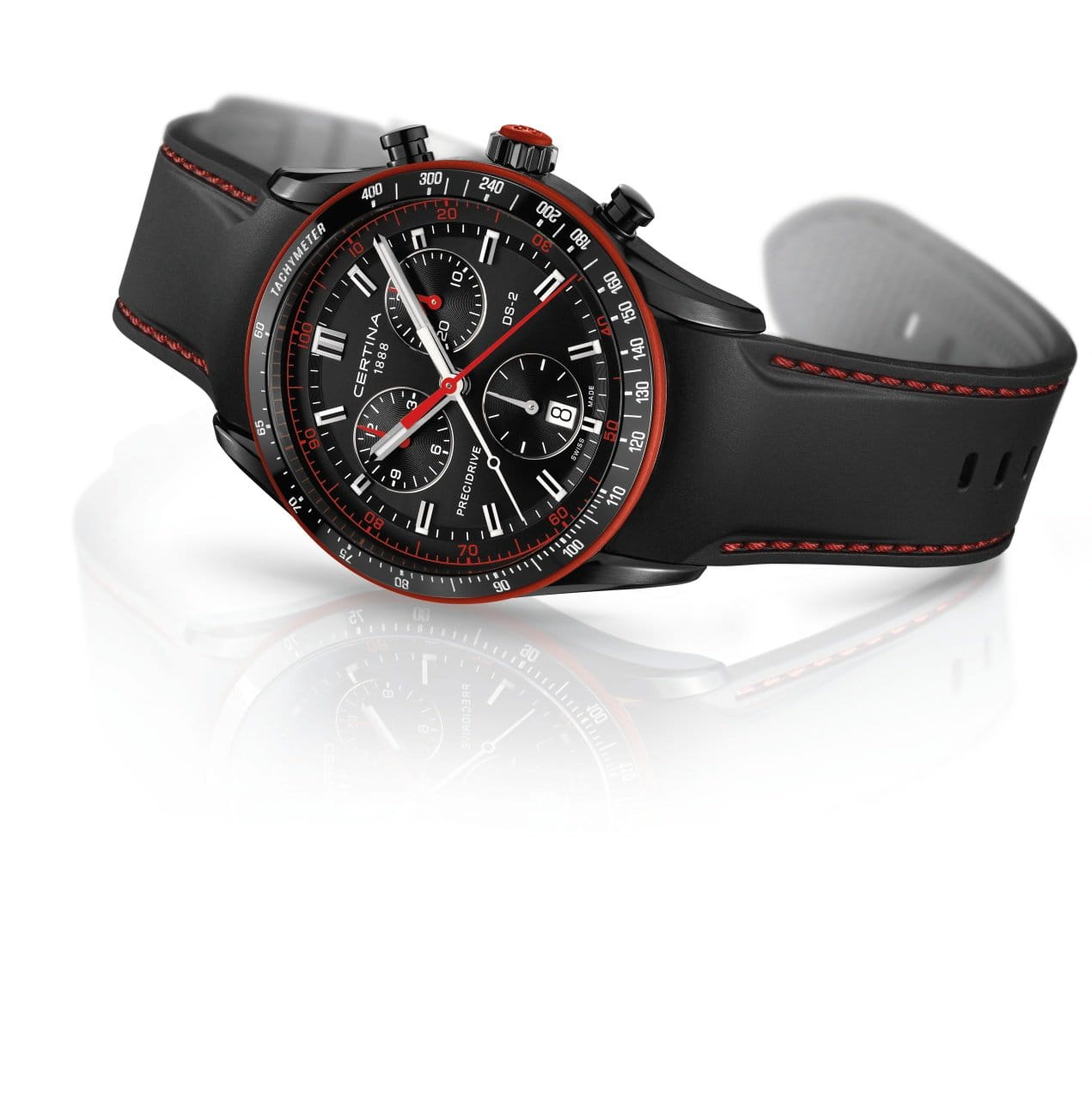 Аксессуар с красными деталями оснащён усложнениями: тахиметрТахиметрРазмеченная шкала, располагается на ободке или безеле часов. Тахиметр позволяет рассчитать скорость на определённом участке пути, расстояние измеряется в километрах или милях., секундомер, календарь, хронографХронографФункция позволяет измерять отрезки времени с особой точностью: часы, минуты, секунды. Верным признаком хронографа является наличие на циферблате 3 дополнительных окошек-счётчиков.. За высокую точность хода отвечает швейцарский кварцевый калибр ETA 251.264 Precidrive™Precidrive™Инновационный кварцевый механизм Certina. Часы, оснащённые этим швейцарским калибром, приравниваются к точности к сертифицированным хронометрам, точность хода составляет +/-10 секунд в год.. Часы основаны на концепции Двойной Надёжности DS ConceptDS ConceptDouble Security Concept, обозначает двойную надёжность и безупречную точность часов Certina. Двойная система защиты подразумевает обеспечение максимальной устойчивости к ударам и высоких показателей водонепроницаемости..