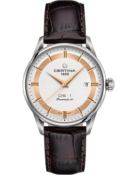 Премиальный аксессуар работает от швейцарского автоматического механизма Powermatic 80Powermatic 80Эксклюзивный калибр от швейцарской компании ETA с увеличенным запасом хода до 80 часов за счёт удлинённой заводной пружины. Характеризуется улучшенной системой спуска со сниженным трением.. Задняя крышка с изображением гор. Сапфировое стекло. Ремешок из натуральной кожи. DS ConceptDS ConceptDouble Security Concept, обозначает двойную надёжность и безупречную точность часов Certina. Двойная система защиты подразумевает обеспечение максимальной устойчивости к ударам и высоких показателей водонепроницаемости.. Дата.