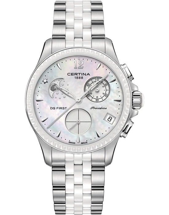 Окошко на позиции 10 часов отображает лунные фазы, стильно смотрится бриллиантовая звезда. Кварцевый швейцарский механизм G10.962 Precidrive™Precidrive™Инновационный кварцевый механизм Certina. Часы, оснащённые этим швейцарским калибром, приравниваются к точности к сертифицированным хронометрам, точность хода составляет +/-10 секунд в год.. Керамический безельБезельВнешний ободок, закрепляющий стекло. В спортивных часах так называется поворотное кольцо с делениями на циферблате, выполняет роль таймера – замеряет отрезки времени на шкале. Неподвижный безель – элемент декора. Однонаправленно вращающийся безель на дайверских часах позволяет фиксировать моменты погружения и выныривания на поверхность.. Стальной браслет с керамическими вставками. EOLEOLПредставляет собой систему, уведомляющую владельца часов о необходимости замены элемента питания. За 2 недели до полного разряда батарейки секундная стрелка перестаёт ходить чётко и начинает перепрыгивать на 3-4 деления., календарь, хронографХронографФункция позволяет измерять отрезки времени с особой точностью: часы, минуты, секунды. Верным признаком хронографа является наличие на циферблате 3 дополнительных окошек-счётчиков..