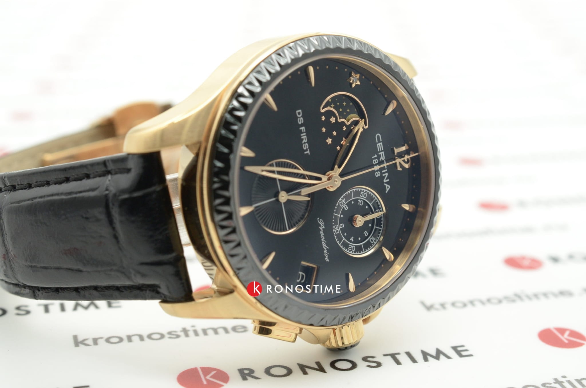 Женские швейцарские часы Certina DS First Lady Chronograph Moon Phase C030.250.36.056.00 из коллекции DS First привлекают эксклюзивным дизайном. Окошко в положении 10 часов отображает лунные фазы, стильно смотрится бриллиантовая звезда. Кварцевый швейцарский механизм G10.962 Precidrive™. Керамический безель с гранёным краем. Чёрный кожаный ремешок. EOL, календарь, хронограф. Производство и сборка: Швейцария.