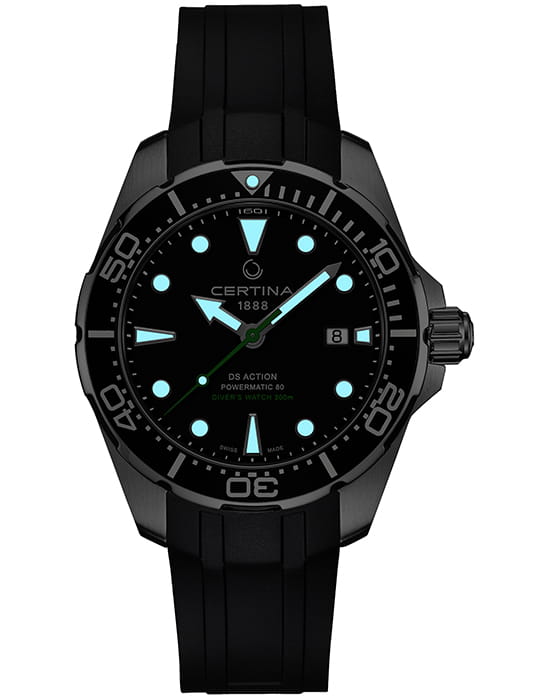 Брендовый аксессуар с чёрным циферблатом подходит для создания акцента для делового образа. Зелёная секундная стрелка и крупные метки обеспечивают превосходную читабельность показаний времени. Автоподзавод. Швейцарский механизм ETA Powermatic 80Powermatic 80Эксклюзивный калибр от швейцарской компании ETA с увеличенным запасом хода до 80 часов за счёт удлинённой заводной пружины. Характеризуется улучшенной системой спуска со сниженным трением. с 80-часовым запасом хода. Реализация системы DS ConceptDS ConceptDouble Security Concept, обозначает двойную надёжность и безупречную точность часов Certina. Двойная система защиты подразумевает обеспечение максимальной устойчивости к ударам и высоких показателей водонепроницаемости.. Сапфировое стекло. Вращающийся безельБезельВнешний ободок, закрепляющий стекло. В спортивных часах так называется поворотное кольцо с делениями на циферблате, выполняет роль таймера – замеряет отрезки времени на шкале. Неподвижный безель – элемент декора. Однонаправленно вращающийся безель на дайверских часах позволяет фиксировать моменты погружения и выныривания на поверхность. из лёгкого алюминия. Водонепроницаемость 300 метров. Люминесцентная подсветкаЛюминесцентное покрытиеПозволяет считывать показания времени в темноте. Производители наносят на стрелки, часовые индексы, безель или поверхность циферблата светонакопительный состав, дающий холодное свечение.. Корпус из нержавеющей стали 316L. Каучуковый ремешок. Застёжка с фиксатором и удлинением для дайверовУдлинение для дайверовЗастёжка с удлинением для дайверов представляет собой безопасное крепление, которое позволяет надевать часы поверх гидрокостюма. Гибкая застёжка удлиняется на 1-2 миллиметра.. Апертура даты. Диаметр корпуса: 43 мм.