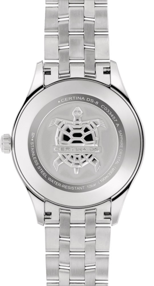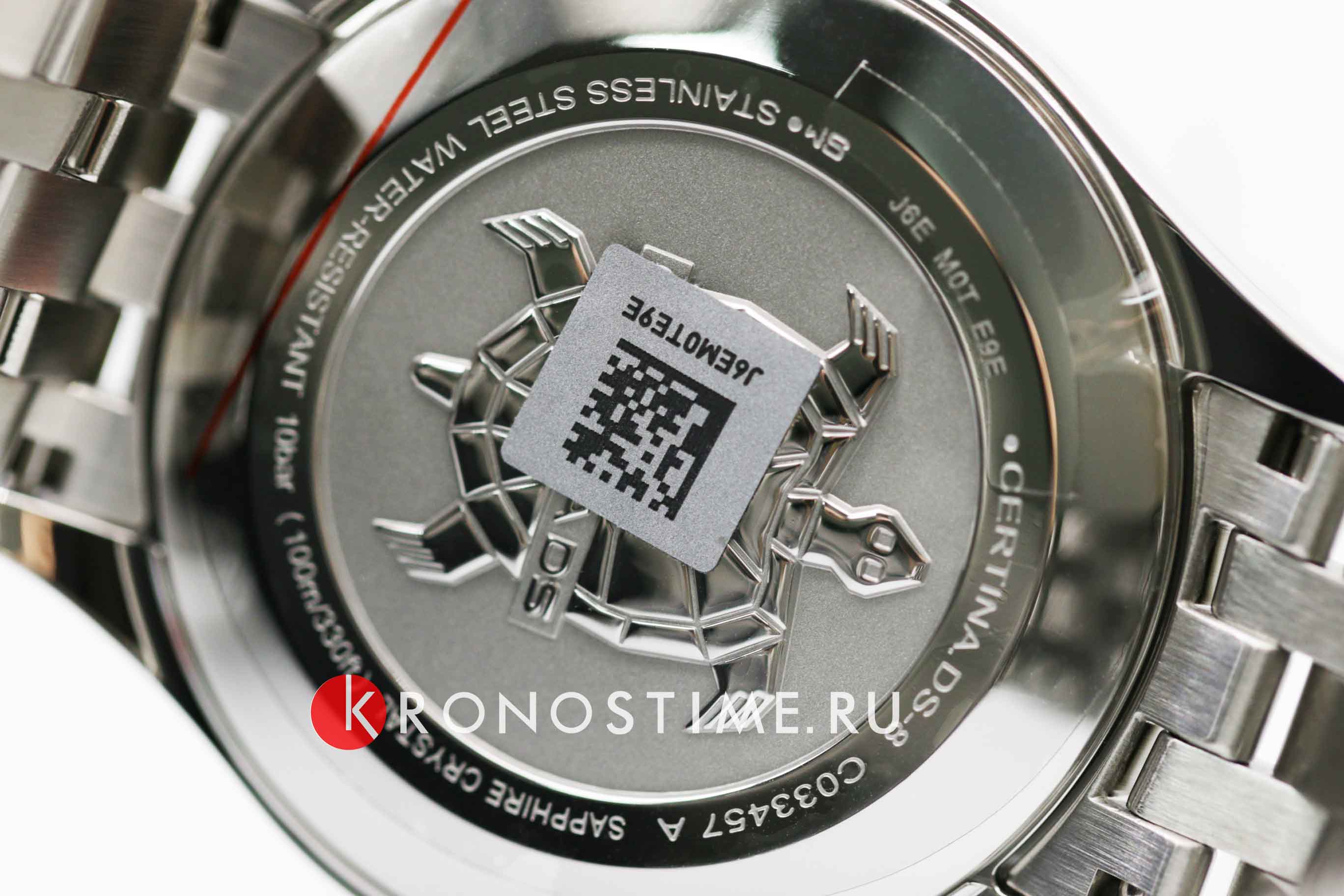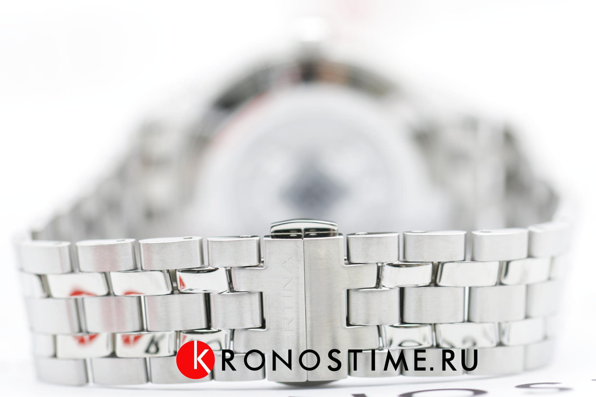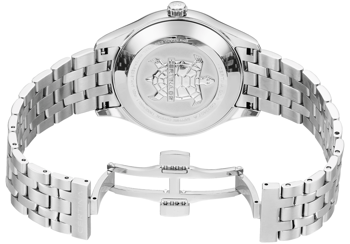 Модель представляет собой элегантную классику, аксессуар точно будет гармоничным дополнением к повседневному или деловому образу. Эффектное окошко в нижней части циферблата являет собой лунный календарь в стильном исполнении. Абсолютная точность хода швейцарского кварцевого калибра ETA F05.841 официально отмечена официальным сертификатом COSCСертификат COSCОфициальный сертификат, подтверждающий то, что часы ходят с особо высокой точностью. Для получения документа часы подвергаются тестовым испытаниям, разработанным швейцарским институтом тестирования хронометров COSC. Допустимая норма для механических часов -4/+6 секунд в день, для кварцевых моделей +/- 0,07 секунд в день.. Система DS ConceptDS ConceptDouble Security Concept, обозначает двойную надёжность и безупречную точность часов Certina. Двойная система защиты подразумевает обеспечение максимальной устойчивости к ударам и высоких показателей водонепроницаемости.. Стальной ударопрочный корпусУдаропрочный корпусМеханизм заключён в корпус, выполненный из современных материалов, устойчивых к ударам, механическим повреждениям и падению с высоты: инновационный пластик, карбон, нержавеющая сталь, титан. и браслет с застёжкой «бабочка»Застёжка "бабочка"Такой вид застёжки дополняется предохранителями, помогающими избежать случайного раскрытия браслета. Обладают изящным исполнением. . Яркая люминесцентная подсветкаЛюминесцентное покрытиеПозволяет считывать показания времени в темноте. Производители наносят на стрелки, часовые индексы, безель или поверхность циферблата светонакопительный состав, дающий холодное свечение.. Сапфировое стекло с антибликовым покрытием. Класс водозащиты WR 100. Функция EOLEOLПредставляет собой систему, уведомляющую владельца часов о необходимости замены элемента питания. За 2 недели до полного разряда батарейки секундная стрелка перестаёт ходить чётко и начинает перепрыгивать на 3-4 деления., прямоугольная апертура даты. Диаметр корпуса: 41 мм.