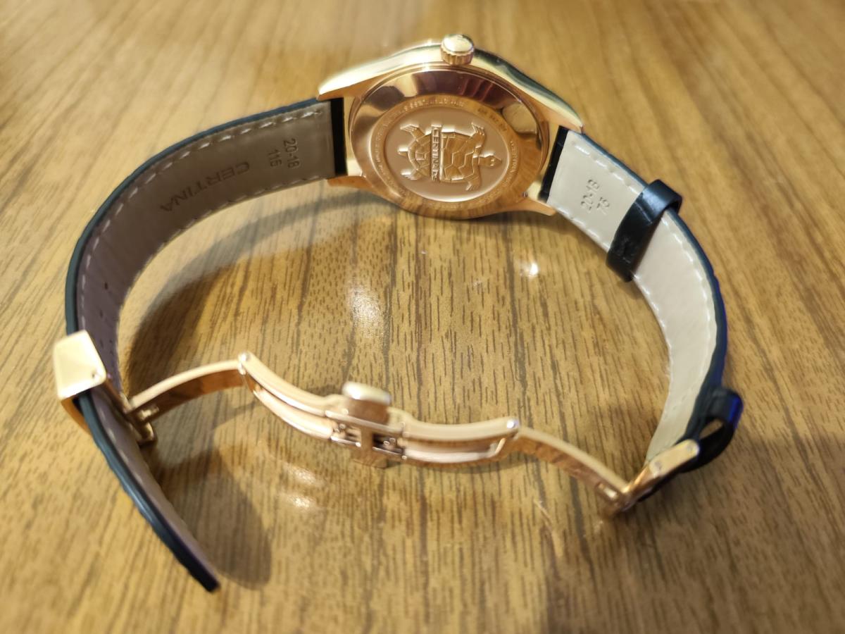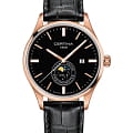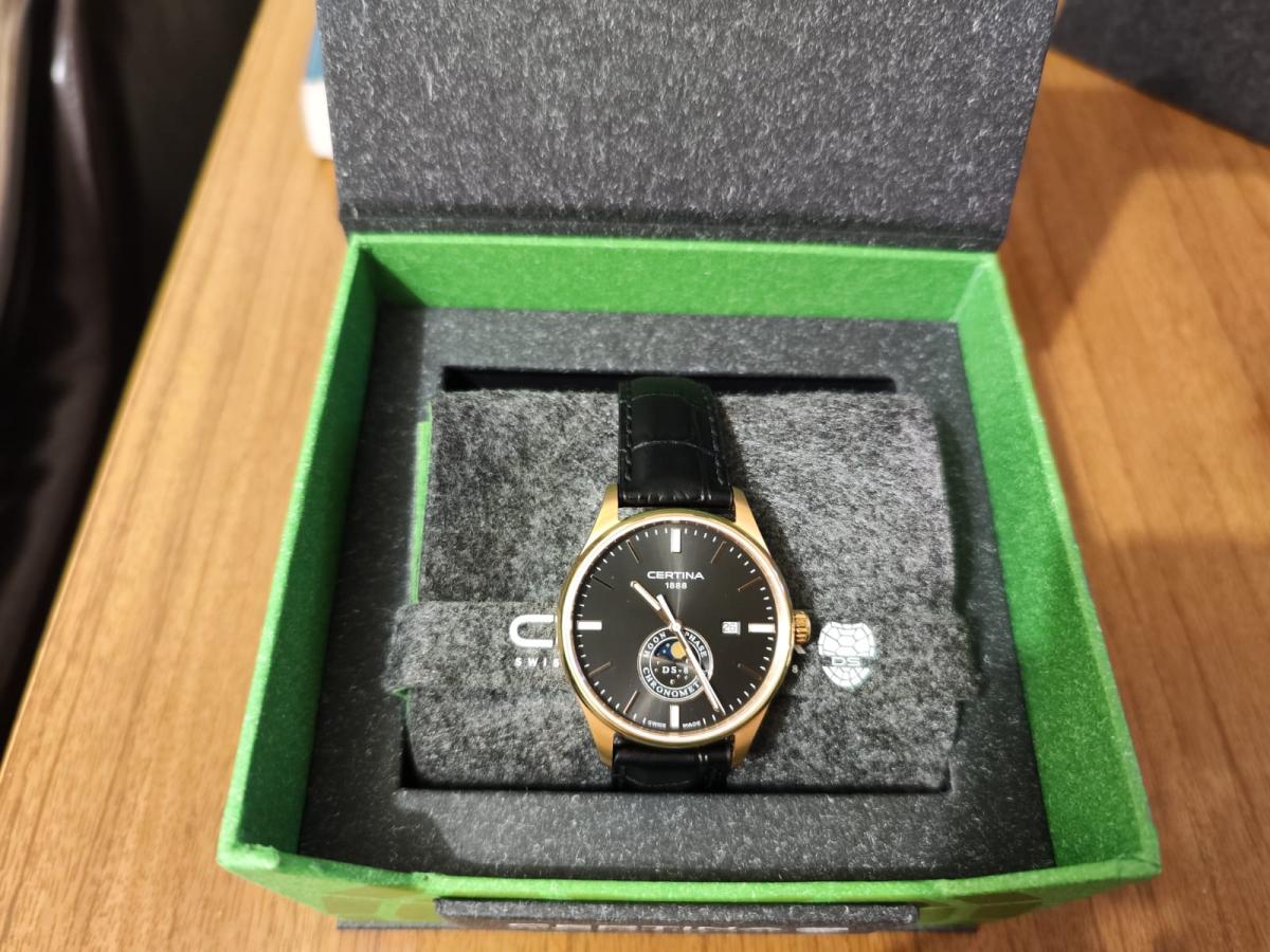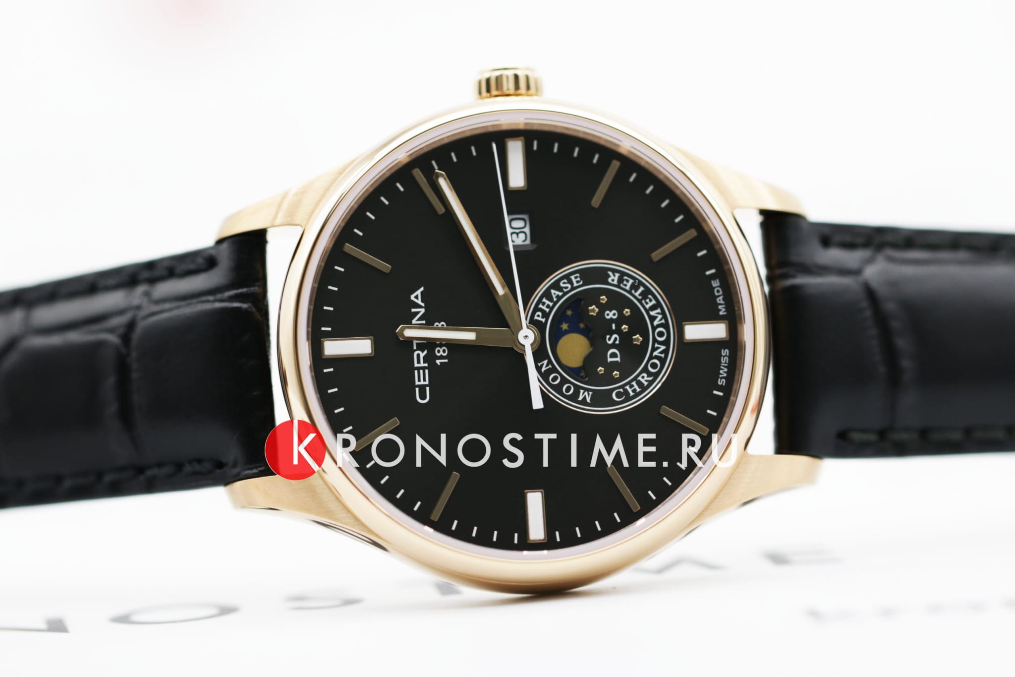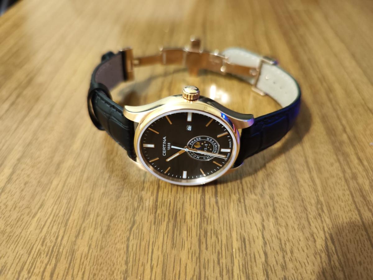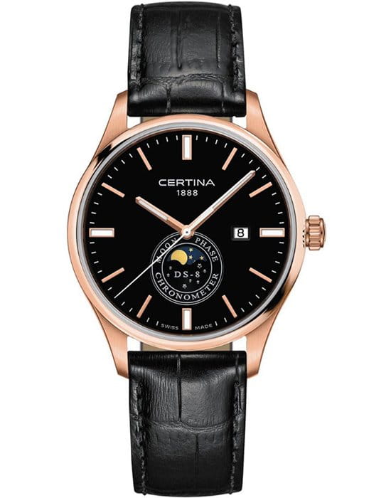 Стильная модель в классическом исполнении оснащена необычным часовым усложнением, окошко в нижней части циферблата отображает лунные фазы. Аксессуар безупречен не только с точки зрения дизайна, он демонстрирует выдающуюся точность хода швейцарского кварцевого механизма ETA F05.841. Такая особенность отмечена официальным сертификатом хронометра COSCСертификат COSCОфициальный сертификат, подтверждающий то, что часы ходят с особо высокой точностью. Для получения документа часы подвергаются тестовым испытаниям, разработанным швейцарским институтом тестирования хронометров COSC. Допустимая норма для механических часов -4/+6 секунд в день, для кварцевых моделей +/- 0,07 секунд в день.. Сапфировое стекло с односторонним антибликовым покрытием. Соблюдение концепции DS ConceptDS ConceptDouble Security Concept, обозначает двойную надёжность и безупречную точность часов Certina. Двойная система защиты подразумевает обеспечение максимальной устойчивости к ударам и высоких показателей водонепроницаемости.. Водостойкость 100 метров. Люминесцентная подсветкаЛюминесцентное покрытиеПозволяет считывать показания времени в темноте. Производители наносят на стрелки, часовые индексы, безель или поверхность циферблата светонакопительный состав, дающий холодное свечение.. Корпус из стали 316L с противокоррозионными свойствами. PVD-покрытиеPVDУльтратонкое покрытие наносится в технике вакуумного напыления, сочетает в себе нитрид титана особой прочности со слоем золота или оксида хрома. Несёт в себе декоративную или защитную функцию.. Ремешок из натуральной кожи. . Функция EOLEOLПредставляет собой систему, уведомляющую владельца часов о необходимости замены элемента питания. За 2 недели до полного разряда батарейки секундная стрелка перестаёт ходить чётко и начинает перепрыгивать на 3-4 деления., отображение текущего числа. Диаметр корпуса: 41 мм.