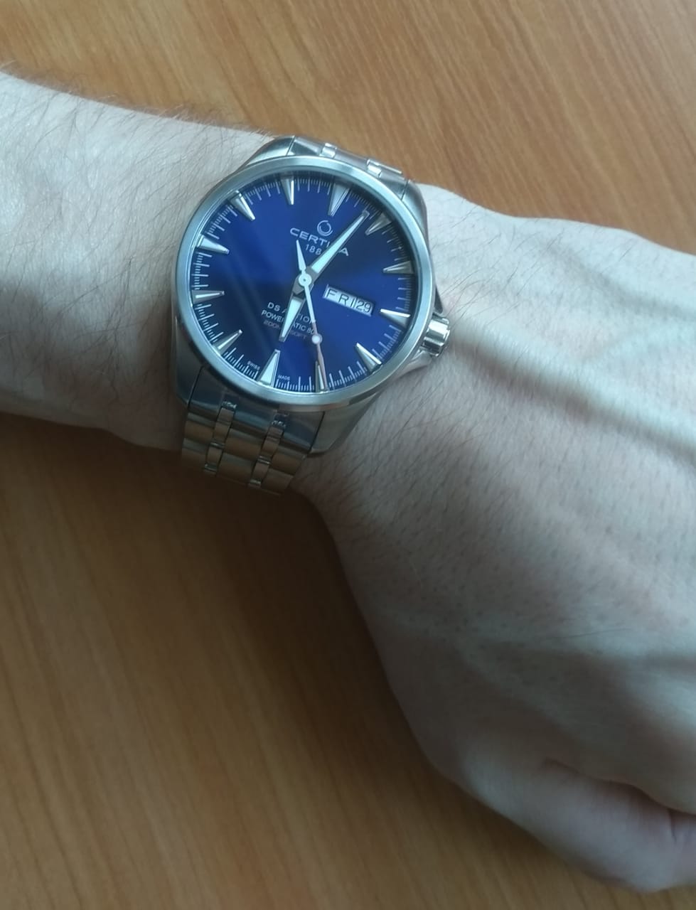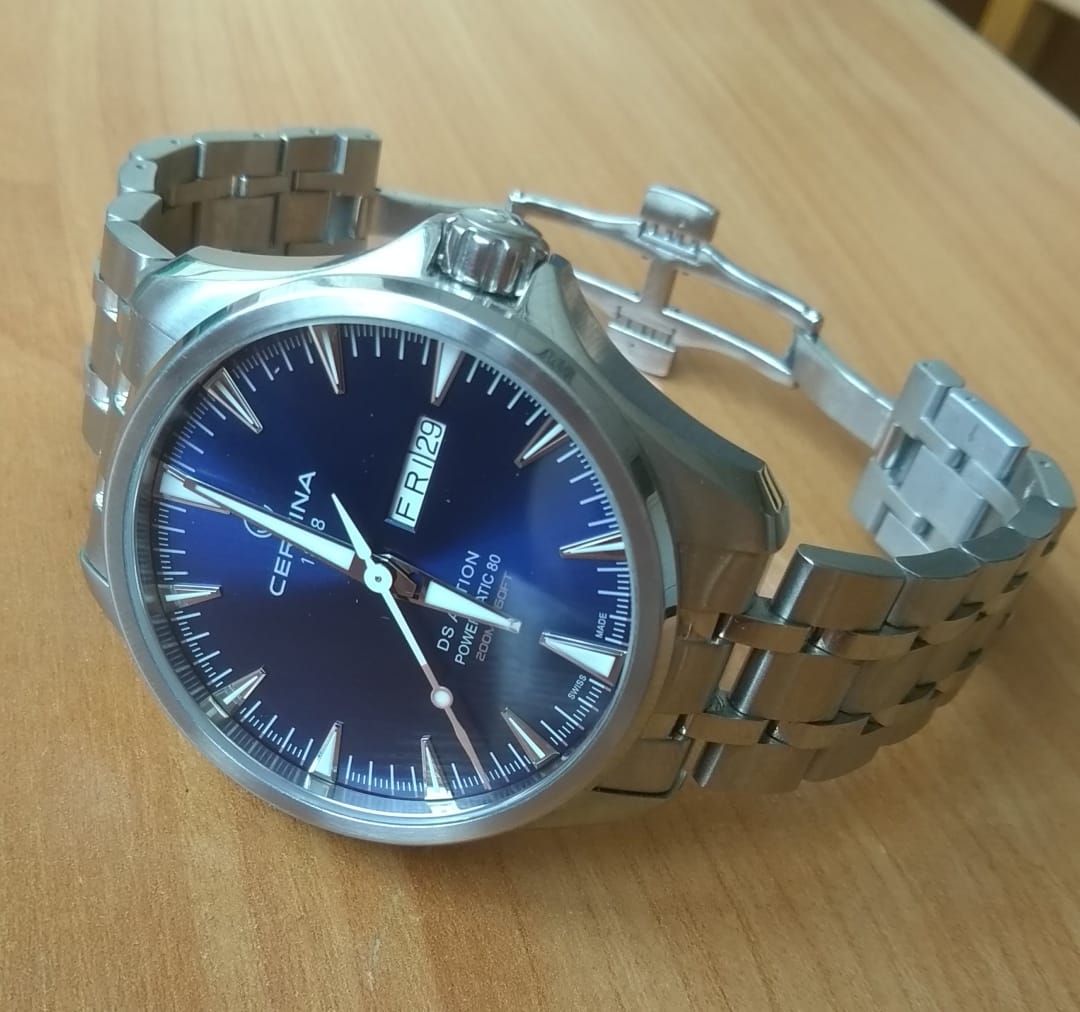 Брендовая модель имеет синий циферблат с контрастными стрелками и часовой разметкой, что обеспечивает хорошую читаемость показателей в любых условиях. Стальной браслет надёжно обхватывает запястье, а предотвращает случайное расстёгивание. Часы работают за счёт швейцарского пружинного механизма ETA Powermatic 80Powermatic 80Эксклюзивный калибр от швейцарской компании ETA с увеличенным запасом хода до 80 часов за счёт удлинённой заводной пружины. Характеризуется улучшенной системой спуска со сниженным трением., его запас хода увеличен до 80 часов. Соблюдение DS ConceptDS ConceptDouble Security Concept, обозначает двойную надёжность и безупречную точность часов Certina. Двойная система защиты подразумевает обеспечение максимальной устойчивости к ударам и высоких показателей водонепроницаемости.. Корпус из нержавеющей стали 316L. Стекло из сапфира с покрытием «антиблик». Водостойкость 200 метров. Подсветка SuperLumiNovaЛюминесцентное покрытиеПозволяет считывать показания времени в темноте. Производители наносят на стрелки, часовые индексы, безель или поверхность циферблата светонакопительный состав, дающий холодное свечение.. Завинчивающаяся задняя крышка. Защищённая заводная головка. Календарь с индикацией числа и дня недели. Диаметр корпуса: 41 мм.