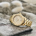 Certina DS Action Lady C032.951.33.361.00 из коллекции DS Action символизируют любовь бренда к водной стихии и высокоточным механизмам. Компактный аксессуар создан по всем правилам дайверской тематики: вращающийся безельБезельВнешний ободок, закрепляющий стекло. В спортивных часах так называется поворотное кольцо с делениями на циферблате, выполняет роль таймера – замеряет отрезки времени на шкале. Неподвижный безель – элемент декора. Однонаправленно вращающийся безель на дайверских часах позволяет фиксировать моменты погружения и выныривания на поверхность., крупная индикация времени, завинчивающаяся заводная головка и задняя крышка. Стильно смотрится золотистый циферблат в сочетании с холодным блеском нержавеющей стали 316L с PVD-покрытиемPVDУльтратонкое покрытие наносится в технике вакуумного напыления, сочетает в себе нитрид титана особой прочности со слоем золота или оксида хрома. Несёт в себе декоративную или защитную функцию.. Часы оснащены швейцарским кварцевым калибром ETA F04.412 Precidrive™Precidrive™Инновационный кварцевый механизм Certina. Часы, оснащённые этим швейцарским калибром, приравниваются к точности к сертифицированным хронометрам, точность хода составляет +/-10 секунд в год., точность хода которого отмечена официальным сертификатом COSCСертификат COSCОфициальный сертификат, подтверждающий то, что часы ходят с особо высокой точностью. Для получения документа часы подвергаются тестовым испытаниям, разработанным швейцарским институтом тестирования хронометров COSC. Допустимая норма для механических часов -4/+6 секунд в день, для кварцевых моделей +/- 0,07 секунд в день.. Модель отличается максимальной водонепроницаемостью 200 метров, сапфировое стекло дополнено антибликовым покрытием. Функции: отображение даты, индикатор EOLEOLПредставляет собой систему, уведомляющую владельца часов о необходимости замены элемента питания. За 2 недели до полного разряда батарейки секундная стрелка перестаёт ходить чётко и начинает перепрыгивать на 3-4 деления.. Диаметр корпуса: 29 мм. Производство и сборка: Швейцария.