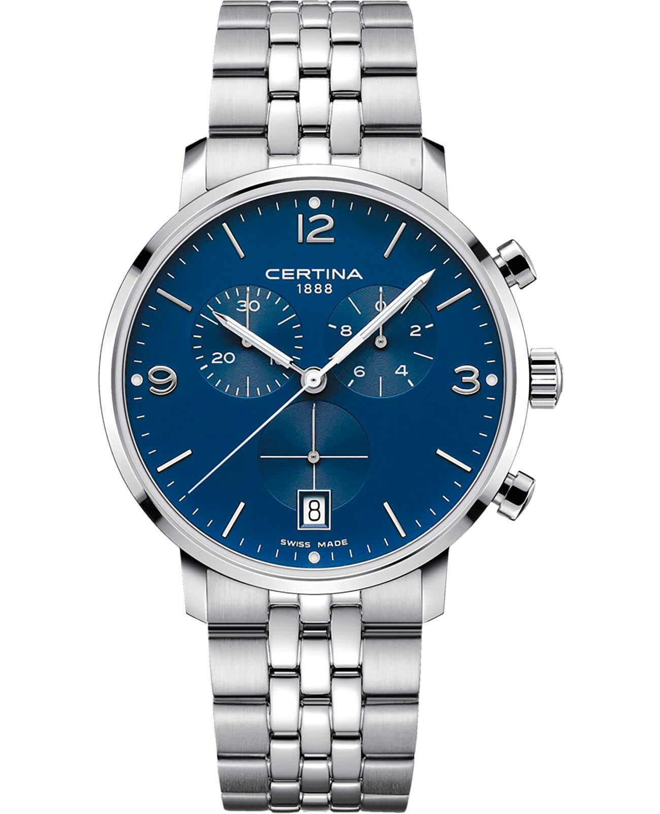 Брендовая модель поможет дополнить образ современного городского жителя. Классический стальной браслет с системой быстрой смены позволяет экспериментировать с образами. ХронографХронографФункция позволяет измерять отрезки времени с особой точностью: часы, минуты, секунды. Верным признаком хронографа является наличие на циферблате 3 дополнительных окошек-счётчиков. наделён синим циферблатом, оттенок приятно гармонирует с серебристым блеском ударопрочного корпусаУдаропрочный корпусМеханизм заключён в корпус, выполненный из современных материалов, устойчивых к ударам, механическим повреждениям и падению с высоты: инновационный пластик, карбон, нержавеющая сталь, титан.. Швейцарский кварцевый механизм ETA G10.212. Концепция Двойной надёжности DS ConceptDS ConceptDouble Security Concept, обозначает двойную надёжность и безупречную точность часов Certina. Двойная система защиты подразумевает обеспечение максимальной устойчивости к ударам и высоких показателей водонепроницаемости.. Сапфировое стекло с обработкой «антиблик». Водостойкость при давлении до 10 бар. Нержавеющая сталь 316L устойчива к царапинам и механическим воздействиям. Секундомер, отображение текущей даты. Диаметр корпуса: 42 мм.