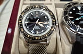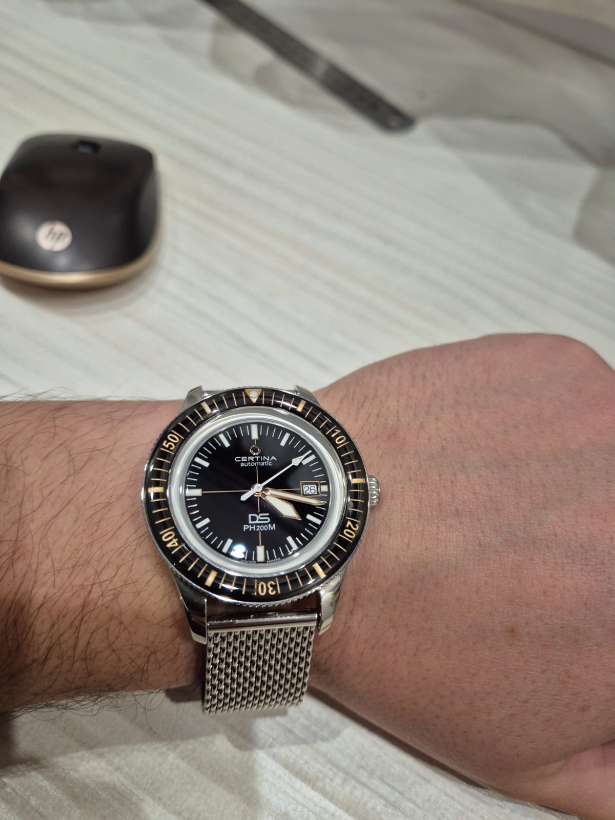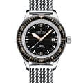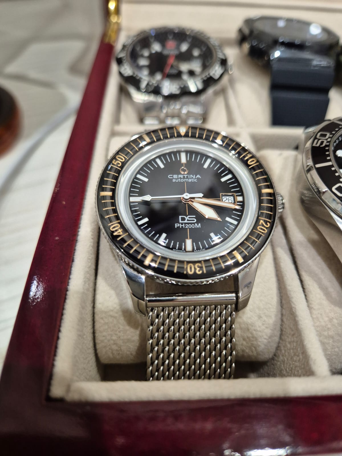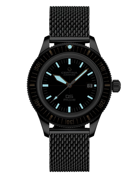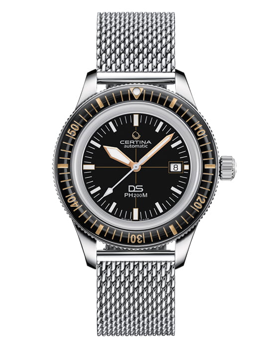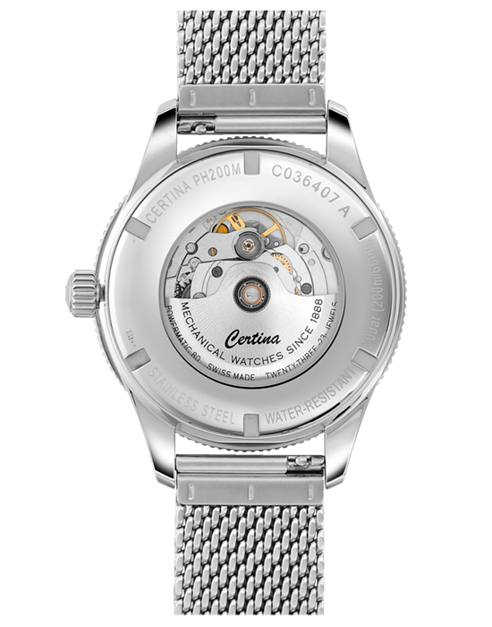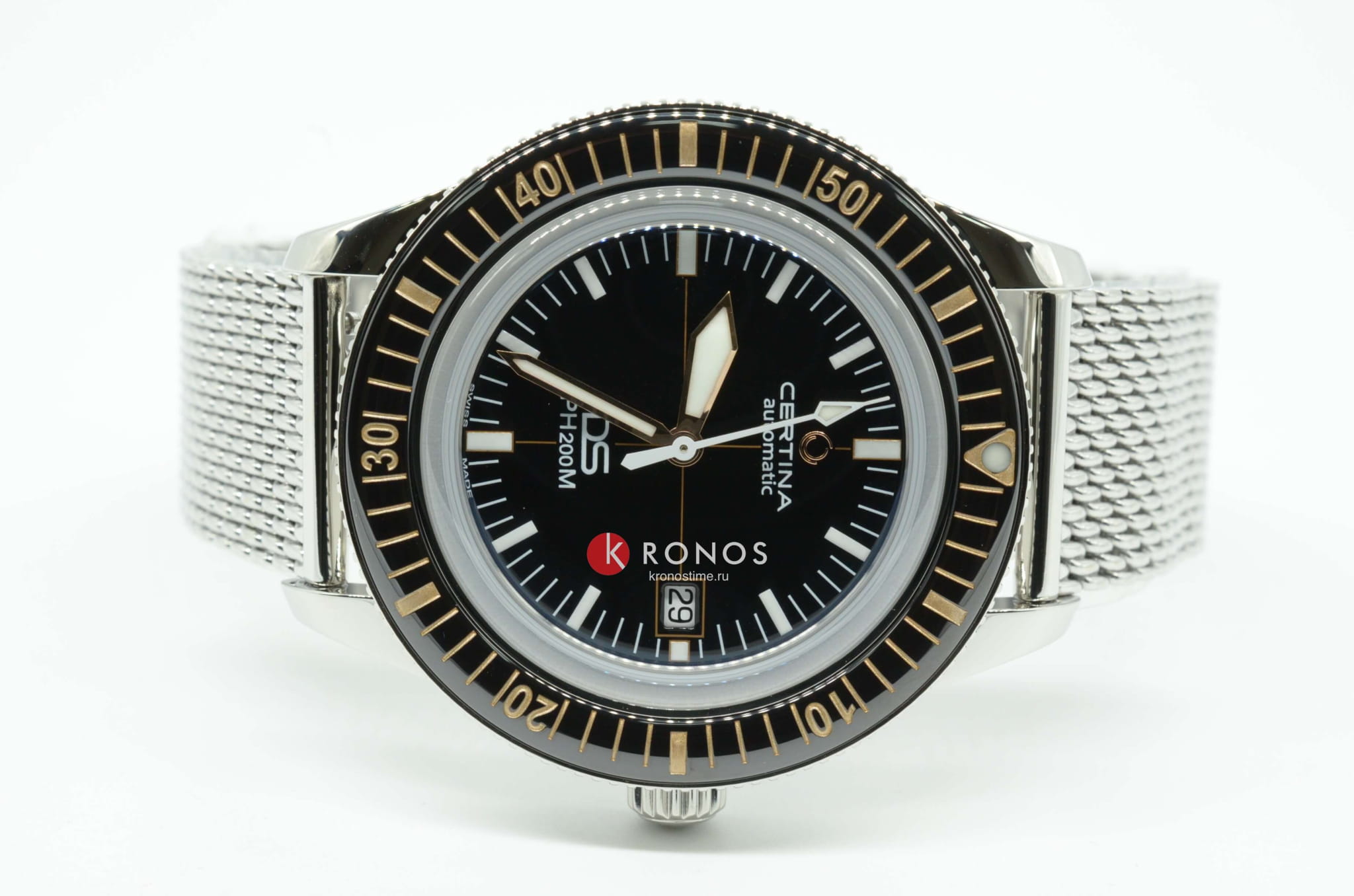 Оригинальный циферблат понравится ценителям ретро-дизайна.Уникальностью обладает не только аксессуар, но и упаковка, сделанная в виде бокса для дайвинга. Часы комплектуются автоматическим механизмом ETA Powermatic 80Powermatic 80Эксклюзивный калибр от швейцарской компании ETA с увеличенным запасом хода до 80 часов за счёт удлинённой заводной пружины. Характеризуется улучшенной системой спуска со сниженным трением. с 80-часовым запасом хода. Технология DS ConceptDS ConceptDouble Security Concept, обозначает двойную надёжность и безупречную точность часов Certina. Двойная система защиты подразумевает обеспечение максимальной устойчивости к ударам и высоких показателей водонепроницаемости.. Стекло с покрытием Nex scratchguard, устойчивым к царапинам. Вращающийся безельБезельВнешний ободок, закрепляющий стекло. В спортивных часах так называется поворотное кольцо с делениями на циферблате, выполняет роль таймера – замеряет отрезки времени на шкале. Неподвижный безель – элемент декора. Однонаправленно вращающийся безель на дайверских часах позволяет фиксировать моменты погружения и выныривания на поверхность.. Диаметр корпуса: 42,8 мм.
