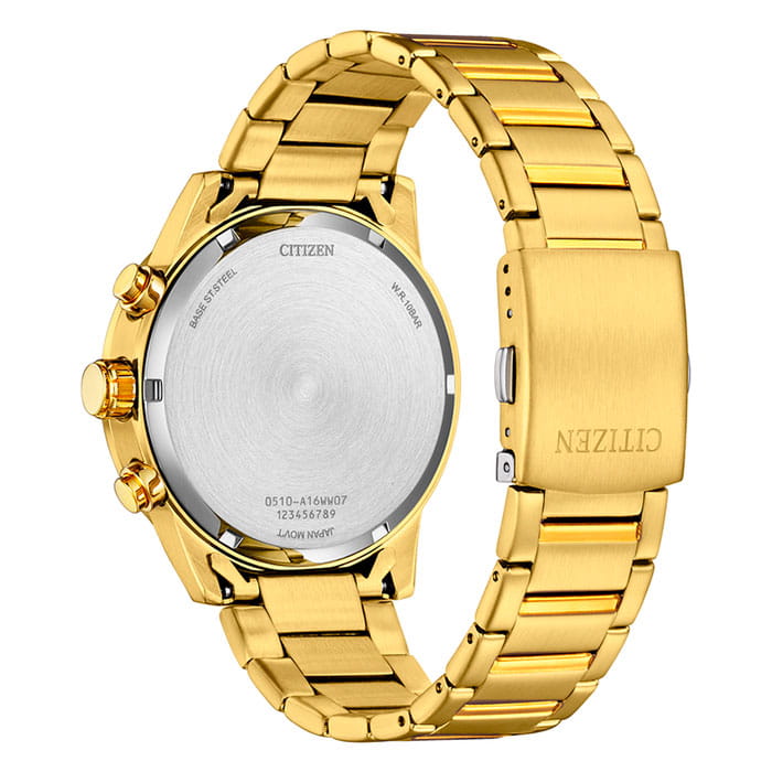 Citizen Chronograph AN3682-54E часы-хронографХронографФункция позволяет измерять отрезки времени с особой точностью: часы, минуты, секунды. Верным признаком хронографа является наличие на циферблате 3 дополнительных окошек-счётчиков. с секундомеромСекундомерСекундоме́р — прибор, способный измерять интервалы времени с точностью до долей секунды. спортивного дизайна с высоким уровнем водозащиты. Корпус из нержавеющей стали с IP-покрытиемIP-покрытиеМетод ионного напыления. Демонстрирует повышенную устойчивость к истиранию, окислению и химическим веществам. Под воздействием высокого давления и температуры около 1500°C молекулы металла надёжно соединяются с частицами корпуса часов. диаметром 44 мм идеально сбалансирован. Минеральное стеклоМинеральное стеклоМинеральное стекло представляет собой искусственно выращенный минерал кварца. Такое стекло отличается особой устойчивостью к повреждениям и царапинам. Уступает по некоторым качествам сапфировому стеклу. обеспечивает отличную защиту циферблата от царапин. Часы работают на основе кварцевого механизма. Стальной браслет на раскладной застёжкеРаскладная застёжкаТакой тип застёжки используется только на браслетах из металла. Она никогда не раскрывается полностью, происходит разделение на 2 и более частей. Раскладывающая застёжка снизит вероятность потери часов к минимуму. идеально дополняют дизайн часов, обеспечивая комфортное ношение. Стрелки и метки на циферблате имеют люминесцентное покрытиеЛюминесцентное покрытиеПозволяет считывать показания времени в темноте. Производители наносят на стрелки, часовые индексы, безель или поверхность циферблата светонакопительный состав, дающий холодное свечение. позволяющее легко определять время даже в темноте. БезельБезельВнешний ободок, закрепляющий стекло. В спортивных часах так называется поворотное кольцо с делениями на циферблате, выполняет роль таймера – замеряет отрезки времени на шкале. Неподвижный безель – элемент декора. Однонаправленно вращающийся безель на дайверских часах позволяет фиксировать моменты погружения и выныривания на поверхность. с IP-покрытиемIP-покрытиеМетод ионного напыления. Демонстрирует повышенную устойчивость к истиранию, окислению и химическим веществам. Под воздействием высокого давления и температуры около 1500°C молекулы металла надёжно соединяются с частицами корпуса часов. и шкалой тахиметраТахиметрРазмеченная шкала, располагается на ободке или безеле часов. Тахиметр позволяет рассчитать скорость на определённом участке пути, расстояние измеряется в километрах или милях.. Секундомер с точностью 1с и временем измерения 12ч отображается центральной стрелкой. Окошко даты находится в положении 3 часа. Часы обладают впечатляющей водонепроницаемостью до 100WR, что делает их идеальными для повседневной носки.