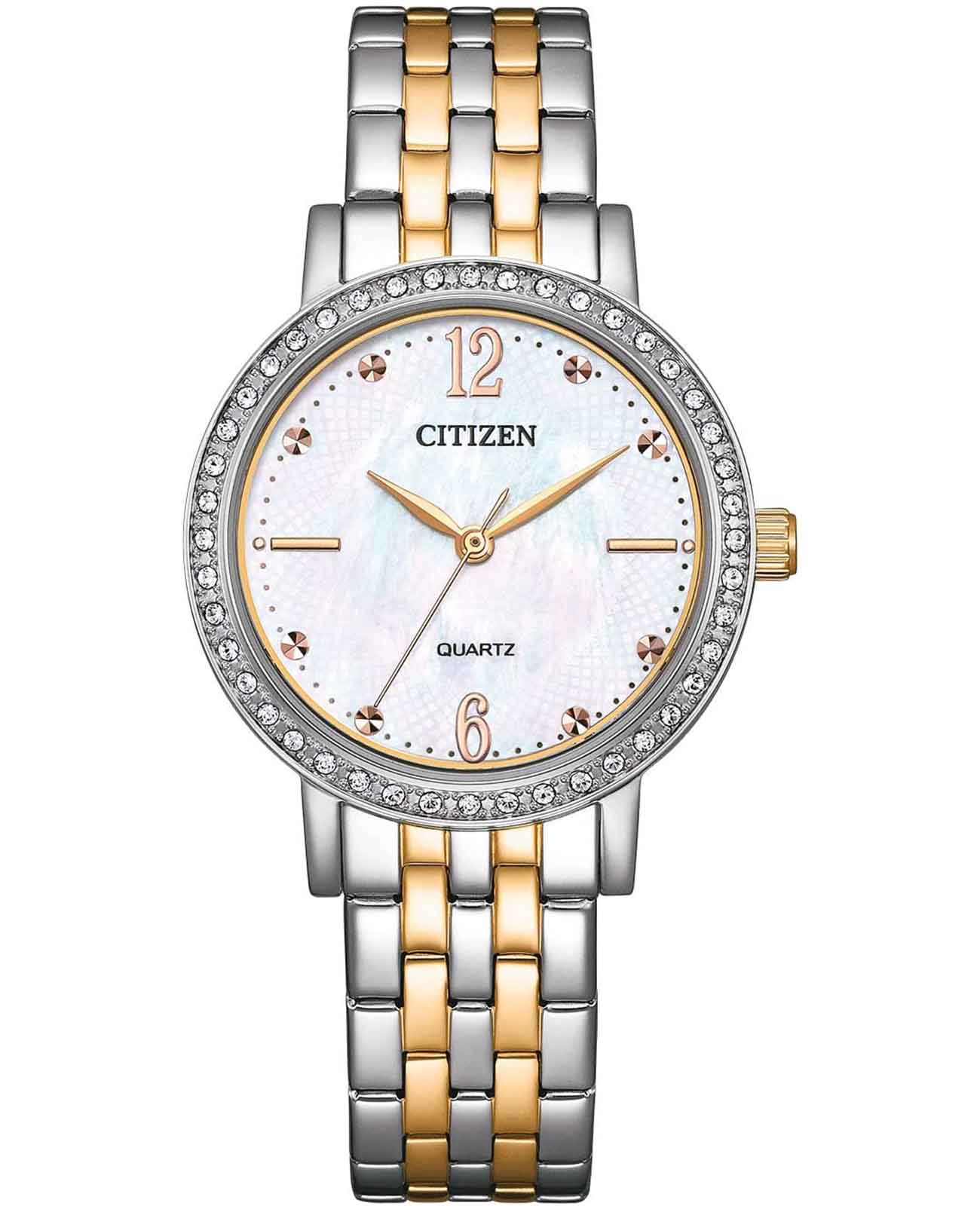 Часы Citizen EL3106-59D представляют собой элегантную модель, выполненную в Японии, сочетающую в себе современные технологии и утончённый дизайн. Корпус  изготовлен из прочной нержавеющей стали, что обеспечивает долговечность и привлекательный внешний вид. Диаметр корпуса составляет 31 мм, а толщина — всего 7 мм, что делает часы изящными и аккуратными на запястье. Особое внимание привлекает безельБезельВнешний ободок, закрепляющий стекло. В спортивных часах так называется поворотное кольцо с делениями на циферблате, выполняет роль таймера – замеряет отрезки времени на шкале. Неподвижный безель – элемент декора. Однонаправленно вращающийся безель на дайверских часах позволяет фиксировать моменты погружения и выныривания на поверхность., украшенный мерцающими кристаллами, которые придают часам особый шарм и изысканность. Надёжный кварцевый механизм гарантирует точность хода, а водозащита уровня WR 50 позволяет не снимать часы при мытье рук или во время дождя. Перламутровый циферблат украшен часовыми индексами в виде точек и цифр, а также оснащён центральными стрелками часов, минут и секунд для удобного считывания времени и кристаллами. Минеральное стеклоМинеральное стеклоМинеральное стекло представляет собой искусственно выращенный минерал кварца. Такое стекло отличается особой устойчивостью к повреждениям и царапинам. Уступает по некоторым качествам сапфировому стеклу. устойчиво к появлению мелких царапин, сохраняя прозрачность и презентабельный вид.  Стальной браслет с частичным золотистым IP-покрытиемIP-покрытиеМетод ионного напыления. Демонстрирует повышенную устойчивость к истиранию, окислению и химическим веществам. Под воздействием высокого давления и температуры около 1500°C молекулы металла надёжно соединяются с частицами корпуса часов. и раскладной застёжкойРаскладная застёжкаТакой тип застёжки используется только на браслетах из металла. Она никогда не раскрывается полностью, происходит разделение на 2 и более частей. Раскладывающая застёжка снизит вероятность потери часов к минимуму. надежно фиксирует часы на запястье, обеспечивая комфорт при ежедневном ношении.