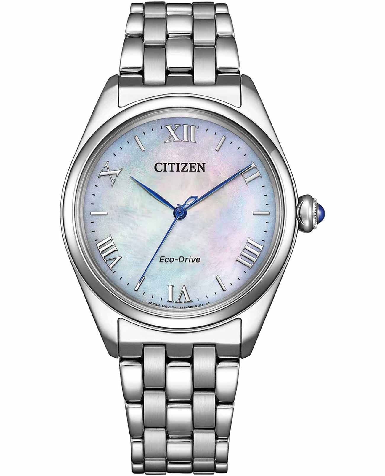 Часы Citizen EM1140-80D созданы для тех, кто ценит изящество и передовые технологии. Модель выполнена в Японии и оснащена кварцевым механизмом Citizen E031 с инновационной системой Eco-Drive, которая обеспечивает питание от солнечной энергии и не требует замены батарейки. Запаса энергии хватает на 180 дней, а функция индикации заряда и система предотвращения перезарядки гарантируют стабильную работу. Корпус диаметром 33 мм и толщиной 8,7 мм изготовлен из высококачественной стали, а перламутровый циферблат с римскими цифрами и штрихами придает часам утончённый вид. Сапфировое стеклоСапфировое стеклоПрочный и надёжный материал из кристалла сапфира синтетического происхождения, характеризующийся особой твёрдостью и устойчивостью к царапинам и повреждениям. надежно защищает циферблат от царапин и повреждений. Заводная головка украшена камнем в форме кабошона, что добавляет особого шарма аксессуару. Стальной браслет с удобной застежкой «бабочка»Застёжка "бабочка"Такой вид застёжки дополняется предохранителями, помогающими избежать случайного раскрытия браслета. Обладают изящным исполнением. обеспечивает комфортную посадку на запястье. Водозащита уровня 50WR позволяет использовать часы в повседневной жизни, не опасаясь попадания влаги. Эта модель станет стильным и надежным дополнением к вашему образу.