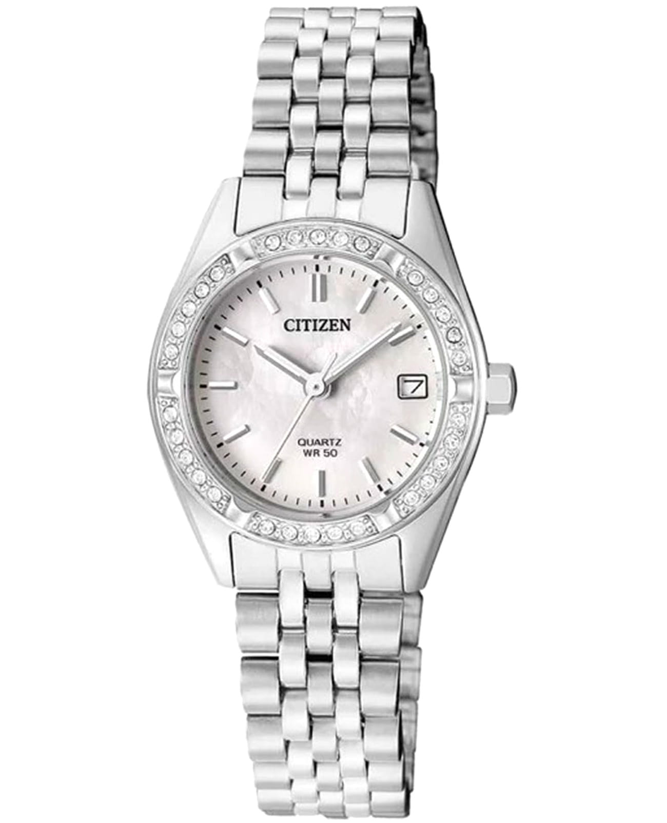 Часы Citizen EU6060-55D представляют собой элегантную модель, выполненную в Японии, сочетающую в себе современные технологии и утончённый дизайн. Корпус и браслет изготовлены из прочной нержавеющей стали, что обеспечивает долговечность и привлекательный внешний вид. Диаметр корпуса составляет 26 мм, что делает часы изящными и аккуратными на запястье. Особое внимание привлекает безельБезельВнешний ободок, закрепляющий стекло. В спортивных часах так называется поворотное кольцо с делениями на циферблате, выполняет роль таймера – замеряет отрезки времени на шкале. Неподвижный безель – элемент декора. Однонаправленно вращающийся безель на дайверских часах позволяет фиксировать моменты погружения и выныривания на поверхность., украшенный мерцающими кристаллами, которые придают часам особый шарм и изысканность. Стрелки с люминесцентным покрытиемЛюминесцентное покрытиеПозволяет считывать показания времени в темноте. Производители наносят на стрелки, часовые индексы, безель или поверхность циферблата светонакопительный состав, дающий холодное свечение.. Надёжный кварцевый механизм гарантирует точность хода, а водозащита уровня WR 50 позволяет не снимать часы при мытье рук или во время дождя. Циферблат украшен часовыми индексами в виде штрихов, а также оснащён окошком даты в позиции 3 часа, центральными стрелками часов, минут и секунд для удобного считывания времени и кристаллами. Минеральное стеклоМинеральное стеклоМинеральное стекло представляет собой искусственно выращенный минерал кварца. Такое стекло отличается особой устойчивостью к повреждениям и царапинам. Уступает по некоторым качествам сапфировому стеклу. устойчиво к появлению мелких царапин, сохраняя прозрачность и презентабельный вид. Стальной браслет с раскладной застёжкойРаскладная застёжкаТакой тип застёжки используется только на браслетах из металла. Она никогда не раскрывается полностью, происходит разделение на 2 и более частей. Раскладывающая застёжка снизит вероятность потери часов к минимуму. надежно фиксирует часы на запястье, обеспечивая комфорт при ежедневном ношении.