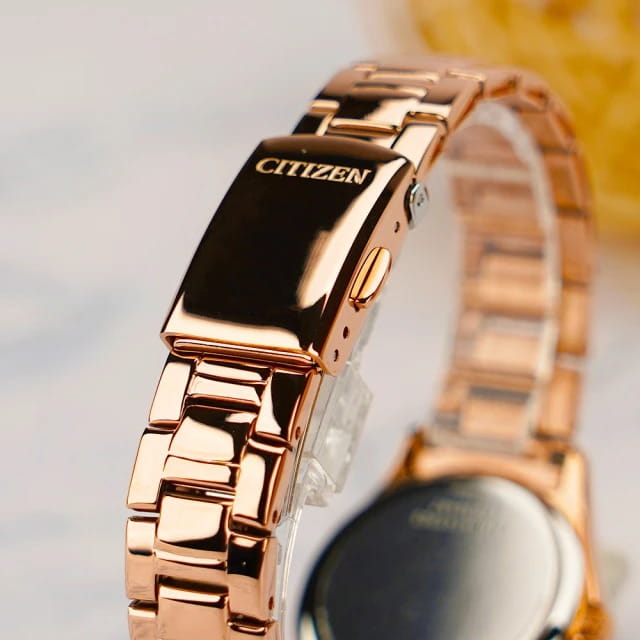 Изящные женские часы Citizen FE1252-82X сочетают в себе современную японскую точность и утончённый стиль. Кварцевый механизм обеспечивает надёжную работу и минимальное отклонение времени. Корпус диаметром 29,5 мм и толщиной 8,5 мм выполнен из нержавеющей стали с изысканным IP-покрытиемIP-покрытиеМетод ионного напыления. Демонстрирует повышенную устойчивость к истиранию, окислению и химическим веществам. Под воздействием высокого давления и температуры около 1500°C молекулы металла надёжно соединяются с частицами корпуса часов. розового золота, что придаёт изделию особый шарм. А безельБезельВнешний ободок, закрепляющий стекло. В спортивных часах так называется поворотное кольцо с делениями на циферблате, выполняет роль таймера – замеряет отрезки времени на шкале. Неподвижный безель – элемент декора. Однонаправленно вращающийся безель на дайверских часах позволяет фиксировать моменты погружения и выныривания на поверхность. часов покрыт кристаллами, что придаёт аксессуару изящный и утончённый вид. Розовый циферблат украшен 60 сверкающими кристаллами, создавая эффектное мерцание при каждом движении. Центральные стрелки отображают часы, минуты и секунды, а окошко даты расположено на отметке «3 часа» для удобства отслеживания текущей даты. Стрелки с люминесцентным покрытиемЛюминесцентное покрытиеПозволяет считывать показания времени в темноте. Производители наносят на стрелки, часовые индексы, безель или поверхность циферблата светонакопительный состав, дающий холодное свечение. обеспечивают отличную читаемость времени даже в темное время суток. Часы оснащены прочным минеральным стекломМинеральное стеклоМинеральное стекло представляет собой искусственно выращенный минерал кварца. Такое стекло отличается особой устойчивостью к повреждениям и царапинам. Уступает по некоторым качествам сапфировому стеклу., защищающим от случайных царапин, и водозащитой уровня WR50, что позволяет не беспокоиться о брызгах и дожде. Стальной браслет с раскладной застёжкойРаскладная застёжкаТакой тип застёжки используется только на браслетах из металла. Она никогда не раскрывается полностью, происходит разделение на 2 и более частей. Раскладывающая застёжка снизит вероятность потери часов к минимуму. на кнопке обеспечивает надёжную фиксацию и комфортную посадку на запястье.