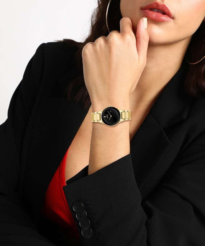 Часы Citizen GA1052-55E произведены в Японии и воплощают стильный минимализм, который гармонично дополнит любой образ. Корпус диаметром 29,5 мм и браслет шириной 16 мм выполнены из прочной нержавеющей стали с износостойким золотистым PVD-покрытиемPVDУльтратонкое покрытие наносится в технике вакуумного напыления, сочетает в себе нитрид титана особой прочности со слоем золота или оксида хрома. Несёт в себе декоративную или защитную функцию., что придает модели современный и лаконичный вид. Черный циферблат с лаконичной разметкой оснащён окошком календаря с указанием числа в положении 3 часа, а минеральное стеклоМинеральное стеклоМинеральное стекло представляет собой искусственно выращенный минерал кварца. Такое стекло отличается особой устойчивостью к повреждениям и царапинам. Уступает по некоторым качествам сапфировому стеклу. надежно защищает его от царапин. Кварцевый механизм Citizen J015 работает на инновационной системе Eco-Drive, благодаря которой часы не требуют замены батарейки и заряжаются от любого источника света, обеспечивая запас хода до 180 дней. Дополнительные функции включают индикацию низкого заряда EOLEOLПредставляет собой систему, уведомляющую владельца часов о необходимости замены элемента питания. За 2 недели до полного разряда батарейки секундная стрелка перестаёт ходить чётко и начинает перепрыгивать на 3-4 деления. и предотвращение перезарядки. Водозащита уровня WR30 позволяет не бояться случайных брызг, а удобная раскладная застёжкаРаскладная застёжкаТакой тип застёжки используется только на браслетах из металла. Она никогда не раскрывается полностью, происходит разделение на 2 и более частей. Раскладывающая застёжка снизит вероятность потери часов к минимуму. гарантирует комфортное ношение. Вес часов составляет 78 грамм. Эта модель станет идеальным выбором для ценителей лаконичного дизайна и современных технологий.