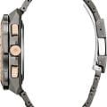 Citizen Promaster JY8146-54E часы-хронографХронографФункция позволяет измерять отрезки времени с особой точностью: часы, минуты, секунды. Верным признаком хронографа является наличие на циферблате 3 дополнительных окошек-счётчиков. с секундомеромСекундомерСекундоме́р — прибор, способный измерять интервалы времени с точностью до долей секунды. спортивного дизайна с высоким уровнем водозащиты. Лимитированная серия - 5600 экземпляров. Модель посвящена 35-летию коллекции Promaster. Корпус из нержавеющей стали с IP-покрытиемIP-покрытиеМетод ионного напыления. Демонстрирует повышенную устойчивость к истиранию, окислению и химическим веществам. Под воздействием высокого давления и температуры около 1500°C молекулы металла надёжно соединяются с частицами корпуса часов. диаметром 45,7 мм идеально сбалансирован. Сапфировое стеклоСапфировое стеклоПрочный и надёжный материал из кристалла сапфира синтетического происхождения, характеризующийся особой твёрдостью и устойчивостью к царапинам и повреждениям. с антибликовым покрытием обеспечивает отличную защиту циферблата от царапин. Часы работают на основе кварцевого механизма, питание от солнечной энергии. Стальной браслет на раскладной застёжкеРаскладная застёжкаТакой тип застёжки используется только на браслетах из металла. Она никогда не раскрывается полностью, происходит разделение на 2 и более частей. Раскладывающая застёжка снизит вероятность потери часов к минимуму. идеально дополняют дизайн часов, обеспечивая комфортное ношение. Стрелки и метки на циферблате имеют люминесцентное покрытиеЛюминесцентное покрытиеПозволяет считывать показания времени в темноте. Производители наносят на стрелки, часовые индексы, безель или поверхность циферблата светонакопительный состав, дающий холодное свечение. позволяющее легко определять время даже в темноте. Поворотный безельБезельВнешний ободок, закрепляющий стекло. В спортивных часах так называется поворотное кольцо с делениями на циферблате, выполняет роль таймера – замеряет отрезки времени на шкале. Неподвижный безель – элемент декора. Однонаправленно вращающийся безель на дайверских часах позволяет фиксировать моменты погружения и выныривания на поверхность. с IP-покрытиемIP-покрытиеМетод ионного напыления. Демонстрирует повышенную устойчивость к истиранию, окислению и химическим веществам. Под воздействием высокого давления и температуры около 1500°C молекулы металла надёжно соединяются с частицами корпуса часов.. Автоматический прием сигналов от радиовышек, расположенных в различных точках земного шара, которые передают временные сигналы от определенных атомных часов. Коррекция текущего времени радиосигналом на территории почти всей Европы, США, Японии и Китая. Функция индикации заряда (EOL) и предотвращения перезарядки. Мировое времяМировое время Полезное часовое усложнение, отображающее время в основных городах и известных областях по всему миру, оно связано с часовыми поясами, удобно для путешественников и бизнесменов. - 43 города, переход на зимнее и летнее время. Всемирное координированное время UTCUTCВсемирное кординационное время, не имеющее привязки к географическому положению Гринвича, основывается на атомном отсчёте времени. Регулировка времени осуществляется более точно, чем устаревшее GMT.