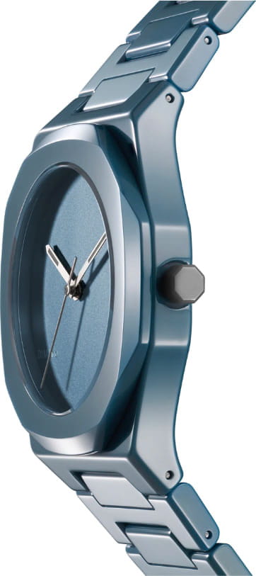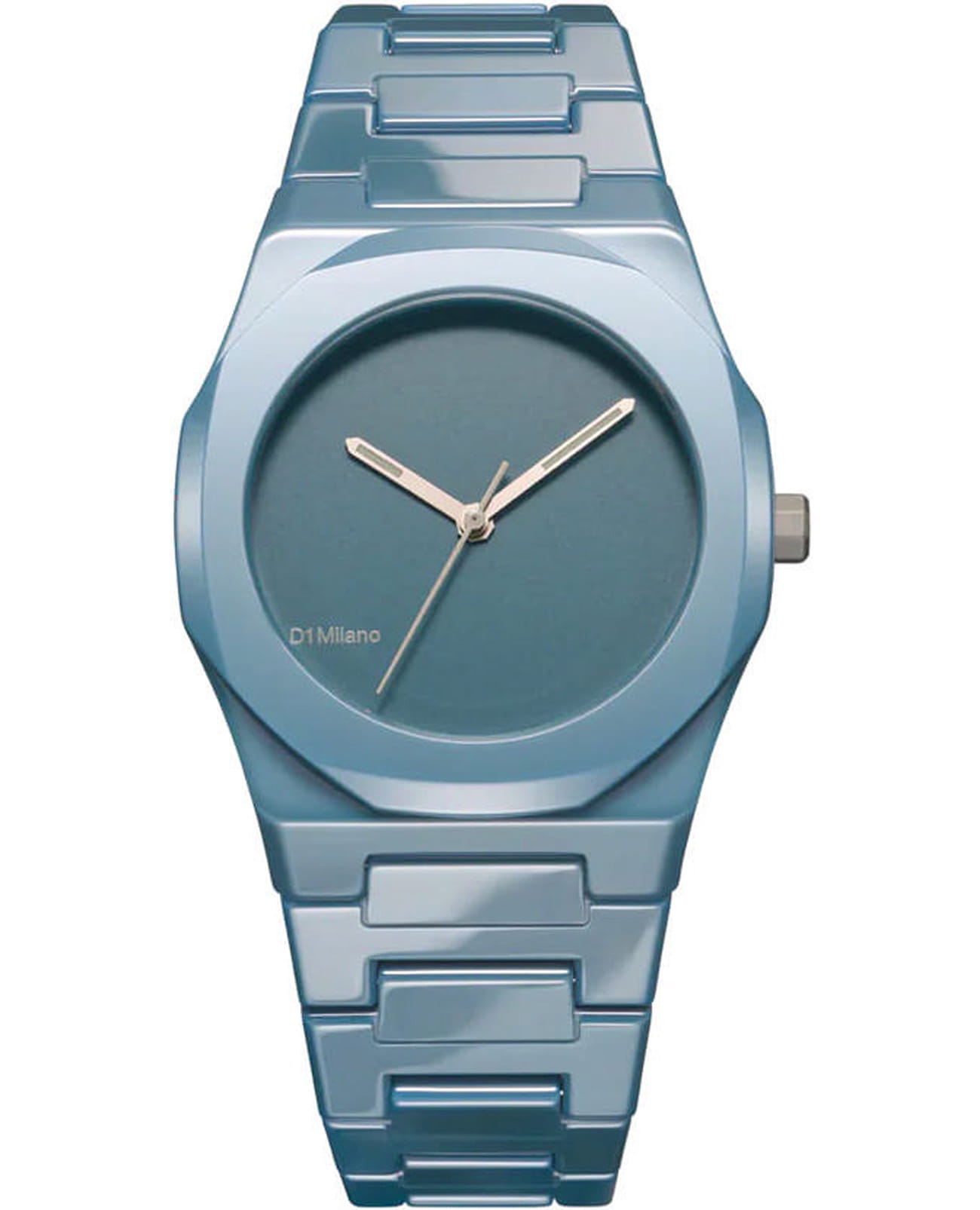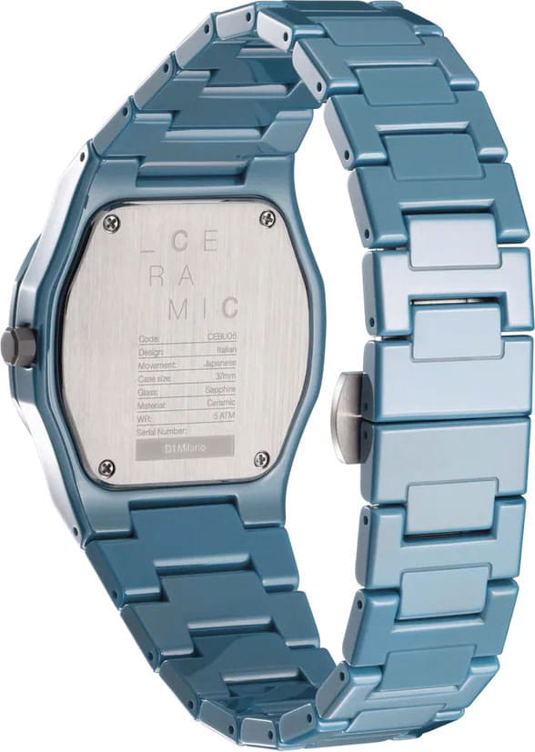 Часы D1 Milano Ceramic Pure Indigo CEBU05 – роскошный аксессуар для современных женщин и мужчин. Кварцевые часы с корпусом из голубой керамики. Минималистичный дизайн циферблата, защищенный прочным сапфировым стекломСапфировое стеклоПрочный и надёжный материал из кристалла сапфира синтетического происхождения, характеризующийся особой твёрдостью и устойчивостью к царапинам и повреждениям. с антибликовым покрытиемАнтибликовое покрытиеСлой оксида металла в 0,13-0,3 микрон, благодаря которому стекло часов не бликует и не отражает свет. Антибликовое покрытие уменьшает отражение света в 10 раз, обеспечивая отличную читаемость показателей циферблата., привлекает внимание своей сдержанной красотой. Циферблат лаконичный, без индексов, с надписью бренда. Изысканные стрелки из латуни с люминесцентным покрытиемЛюминесцентное покрытиеПозволяет считывать показания времени в темноте. Производители наносят на стрелки, часовые индексы, безель или поверхность циферблата светонакопительный состав, дающий холодное свечение.. Стальная задняя крышка с PVD-покрытиемPVDУльтратонкое покрытие наносится в технике вакуумного напыления, сочетает в себе нитрид титана особой прочности со слоем золота или оксида хрома. Несёт в себе декоративную или защитную функцию. закреплена на 4 винтах, что обеспечивает надежность конструкции. Элегантный керамический браслет с застёжкой «бабочка» с кнопкамиЗастёжка "бабочка"Такой вид застёжки дополняется предохранителями, помогающими избежать случайного раскрытия браслета. Обладают изящным исполнением. .  Водозащита 50 метров защищает часы от брызг и дождя, делая их подходящими для повседневного использования. Часы сочетают в себе классический дизайн и современные технологии производства.