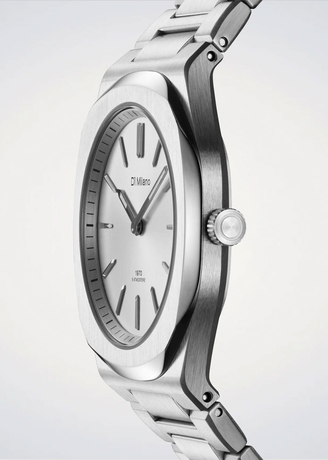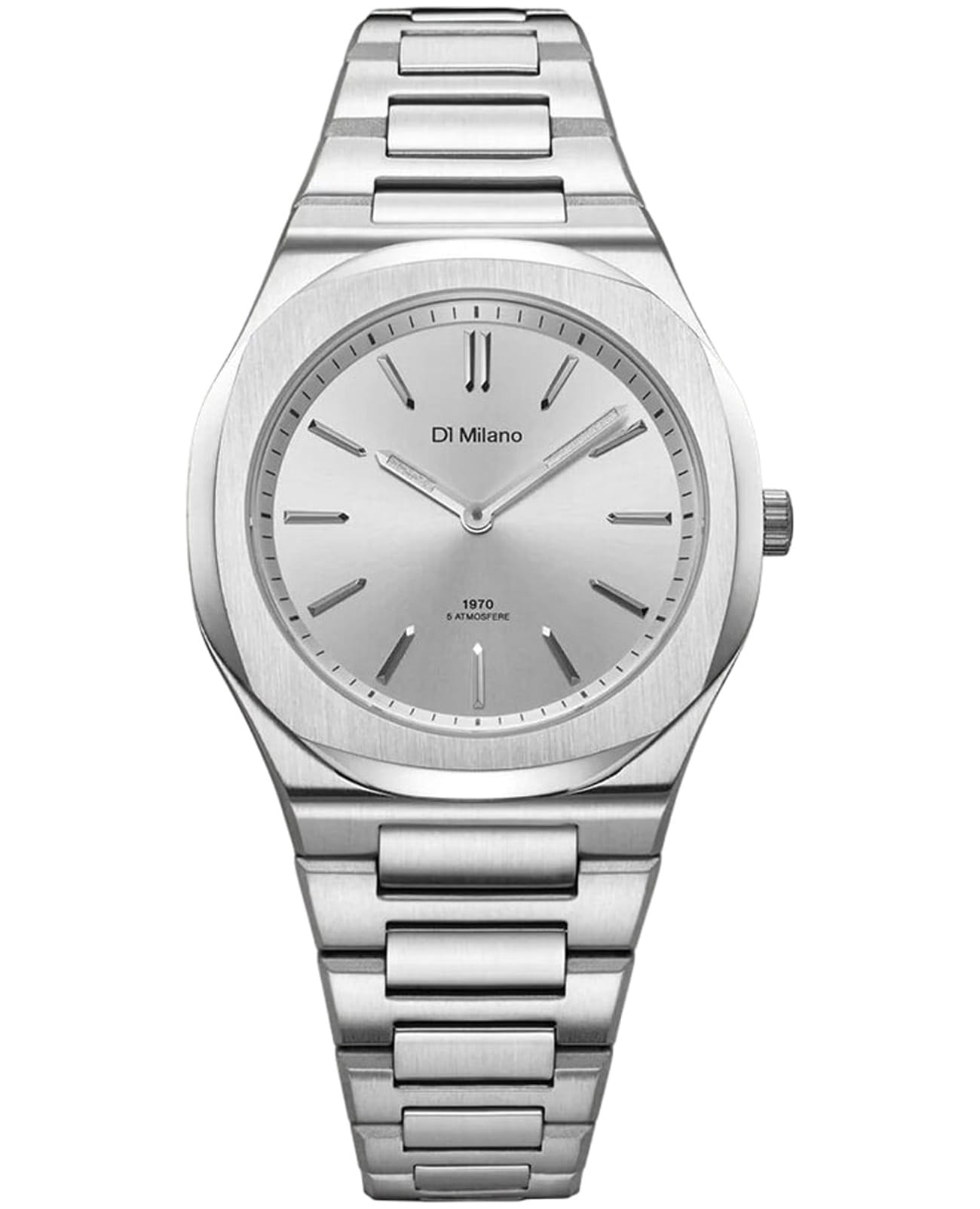 Женские кварцевые часы D1 Milano Ultra Thin UHBL01 — это стильное сочетание элегантности и современного дизайна. Изящный ультратонкий корпус выполнен из нержавеющей стали, диаметром 34 мм, что придаст образу элегантности и надежности. Изысканный циферблат с метками в виде штрихов придает модели особый блеск. Циферблат защищен сапфировым стекломСапфировое стеклоПрочный и надёжный материал из кристалла сапфира синтетического происхождения, характеризующийся особой твёрдостью и устойчивостью к царапинам и повреждениям. с антибликовым покрытиемАнтибликовое покрытиеСлой оксида металла в 0,13-0,3 микрон, благодаря которому стекло часов не бликует и не отражает свет. Антибликовое покрытие уменьшает отражение света в 10 раз, обеспечивая отличную читаемость показателей циферблата., обеспечивающий устойчивость к царапинам. Стрелки с люминесцентным покрытиемЛюминесцентное покрытиеПозволяет считывать показания времени в темноте. Производители наносят на стрелки, часовые индексы, безель или поверхность циферблата светонакопительный состав, дающий холодное свечение.. Часы оснащены надежным кварцевым механизмом. Стальной браслет на застёжке-бабочке с кнопкамиЗастёжка "бабочка"Такой вид застёжки дополняется предохранителями, помогающими избежать случайного раскрытия браслета. Обладают изящным исполнением. , гарантирует комфортное и безопасное ношение. Класс водозащиты: 50 метров позволит защитить корпус от случайных брызг или капель дождя. Отличный выбор для тех, кто ценит утонченность и качество.
