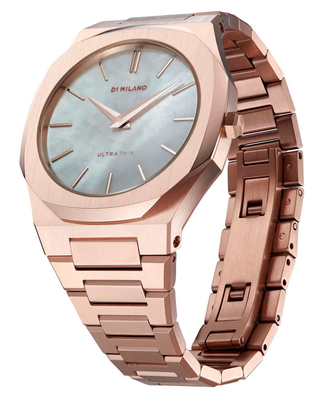 Наручные часы D1 Milano UTBL20 из коллекции Ultra Thin сочетают в себе элегантный дизайн и современные технологии. Модель обладает круглым корпусом диаметром 34 мм, изготовленным из нержавеющей стали с PVD-покрытиемPVDУльтратонкое покрытие наносится в технике вакуумного напыления, сочетает в себе нитрид титана особой прочности со слоем золота или оксида хрома. Несёт в себе декоративную или защитную функцию., что обеспечивает высокую устойчивость к внешним воздействиям. Для защиты циферблата используется сапфировое стеклоСапфировое стеклоПрочный и надёжный материал из кристалла сапфира синтетического происхождения, характеризующийся особой твёрдостью и устойчивостью к царапинам и повреждениям., которое эффективно противостоит царапинам и механическим повреждениям. Часы оснащены кварцевым механизмом, гарантирующим точное время без необходимости подзаводки. Водонепроницаемость модели достигает 5 атмосферы (50 метров), что позволяет использовать их при контакте с водой, например, во время мытья рук или дождя. Браслет выполнен из нержавеющей стали с PVD-покрытиемPVDУльтратонкое покрытие наносится в технике вакуумного напыления, сочетает в себе нитрид титана особой прочности со слоем золота или оксида хрома. Несёт в себе декоративную или защитную функцию. и с раскладной застежкойРаскладной замокДанный вариант застежки используется только на часах с металлическим браслетом. Отличительная особенность такого крепления в том, что длина браслета становится универсальной и вы можете самостоятельно отрегулировать нужный вам размер – застежка просто двигается по браслету часов., обеспечивающей комфортное ношение и безопасность. Циферблат выполнен из перламутра, что придает часам особую изысканность и делает их идеальным выбором для повседневного использования или особых случаев.