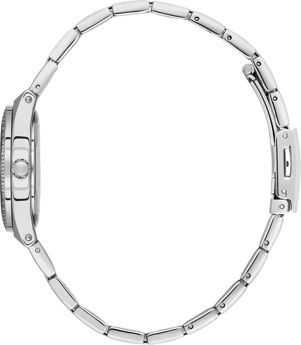 Женские кварцевые часы Daniel Klein — это роскошный аксессуар, подчеркивающий статус и безупречный вкус. Корпус диаметром 30 мм выполнен из нержавеющей стали. БезельБезельВнешний ободок, закрепляющий стекло. В спортивных часах так называется поворотное кольцо с делениями на циферблате, выполняет роль таймера – замеряет отрезки времени на шкале. Неподвижный безель – элемент декора. Однонаправленно вращающийся безель на дайверских часах позволяет фиксировать моменты погружения и выныривания на поверхность. инкрустирован кристаллами. Циферблат серебристого цвета выполнен по технологии Sunray («солнечные лучи») и оформлен точками с кристаллами и стрелками. Стрелки с люминесцентным покрытиемЛюминесцентное покрытиеПозволяет считывать показания времени в темноте. Производители наносят на стрелки, часовые индексы, безель или поверхность циферблата светонакопительный состав, дающий холодное свечение., обеспечивающим хорошую читаемость в темноте. Циферблат защищён минеральным стекломМинеральное стеклоМинеральное стекло представляет собой искусственно выращенный минерал кварца. Такое стекло отличается особой устойчивостью к повреждениям и царапинам. Уступает по некоторым качествам сапфировому стеклу.. Механизм — кварцевый калибр Miyota 2035. Часы оснащены стальным браслетом на раскладной застёжкеРаскладная застёжкаТакой тип застёжки используется только на браслетах из металла. Она никогда не раскрывается полностью, происходит разделение на 2 и более частей. Раскладывающая застёжка снизит вероятность потери часов к минимуму.. Водонепроницаемость 30 м позволяет использовать часы в повседневных условиях. Идеальный выбор для тех, кто ценит турецкое качество и элегантный дизайн.