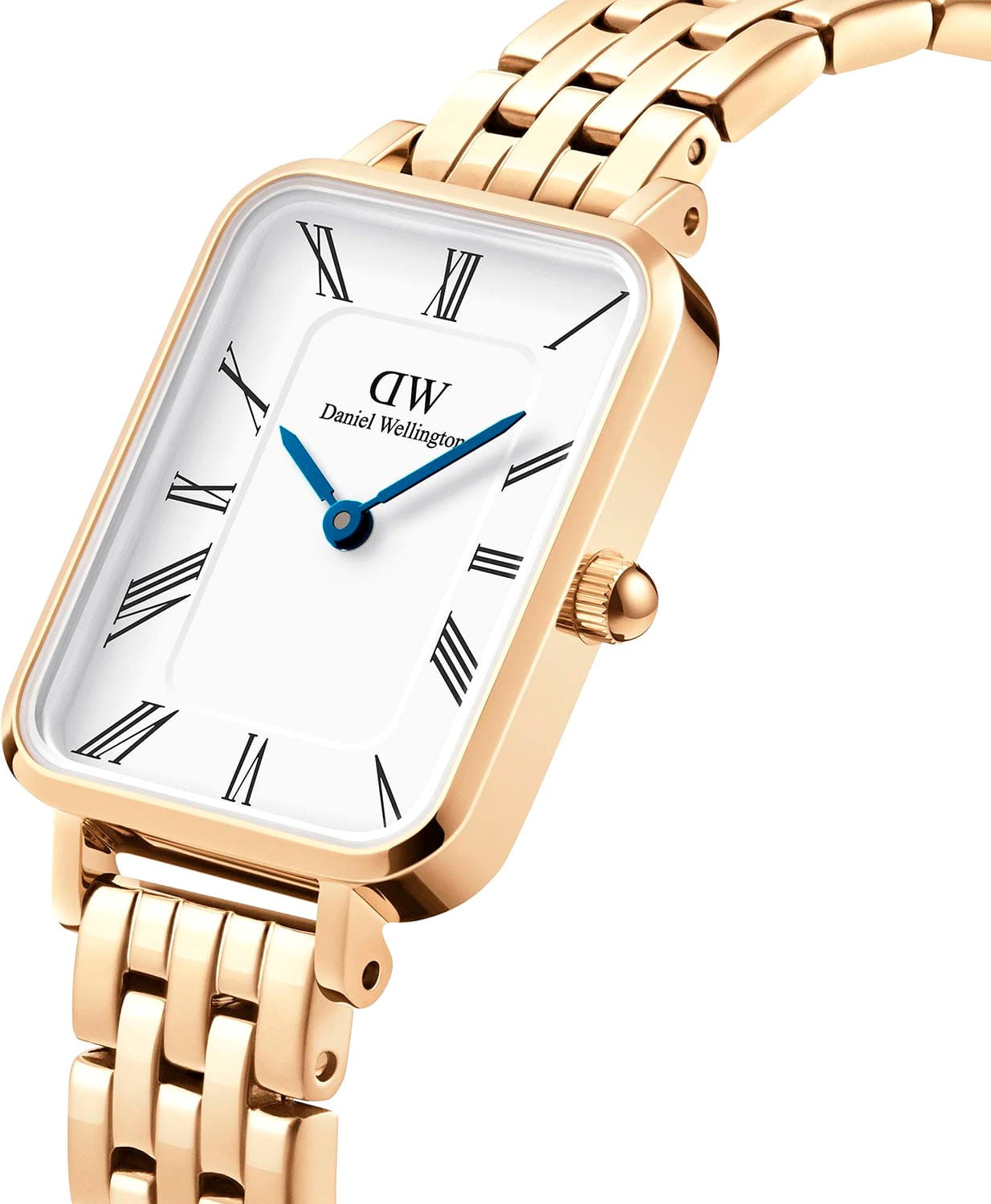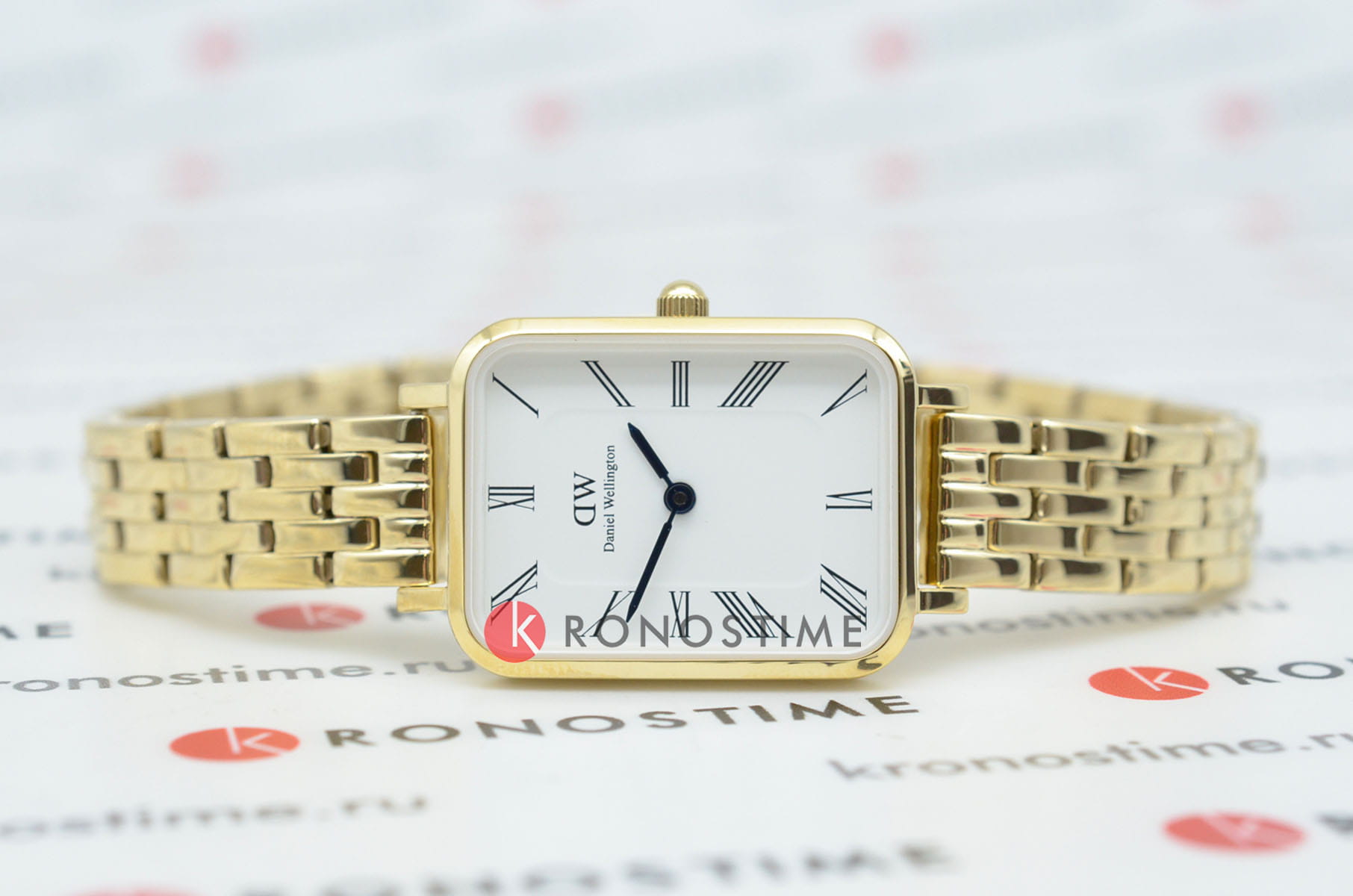 Женские наручные часы с минеральным стекломМинеральное стеклоМинеральное стекло представляет собой искусственно выращенный минерал кварца. Такое стекло отличается особой устойчивостью к повреждениям и царапинам. Уступает по некоторым качествам сапфировому стеклу. Daniel Wellington Quadro Roman Numerals 5-Link Gold DW00100688, кварцевый механизм с высокой точностью. Корпус часов изготовлен из нержавеющей стали 316L PVD-покрытиемPVDУльтратонкое покрытие наносится в технике вакуумного напыления, сочетает в себе нитрид титана особой прочности со слоем золота или оксида хрома. Несёт в себе декоративную или защитную функцию.. Циферблат с аккуратными римскими индексами. Японский кварцевый механизм. Рифленая заводная головка. Класс водозащиты: 30 метров, позволит защитить корпус от случайных брызг или капель дождя. Стальной браслет с PVD-покрытиемPVDУльтратонкое покрытие наносится в технике вакуумного напыления, сочетает в себе нитрид титана особой прочности со слоем золота или оксида хрома. Несёт в себе декоративную или защитную функцию. на застежке бабочкеЗастёжка "бабочка"Такой вид застёжки дополняется предохранителями, помогающими избежать случайного раскрытия браслета. Обладают изящным исполнением. .