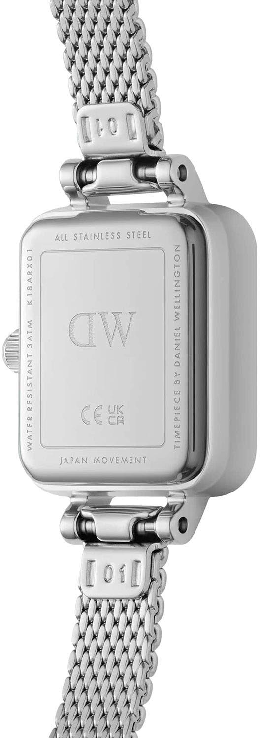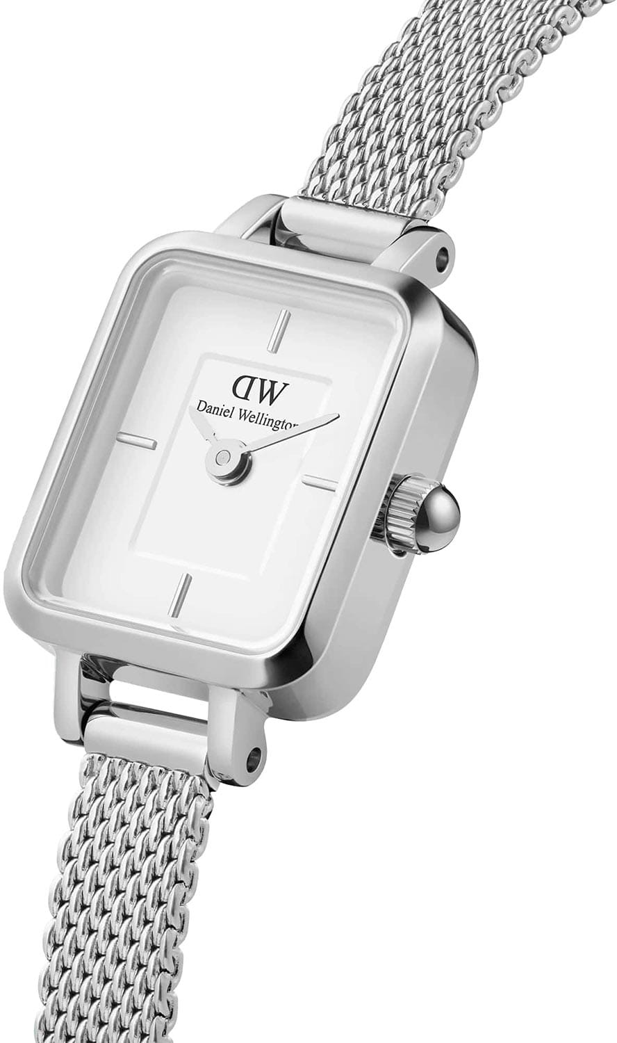 Женские наручные часы с минеральным стекломМинеральное стеклоМинеральное стекло представляет собой искусственно выращенный минерал кварца. Такое стекло отличается особой устойчивостью к повреждениям и царапинам. Уступает по некоторым качествам сапфировому стеклу. Daniel Wellington Quadro Mini Sterling DW00100726, кварцевый механизм с высокой точностью. Корпус часов изготовлен из нержавеющей стали. Накладные метки в виде штрихов. Японский кварцевый механизм. Рифленая заводная головка. Класс водозащиты: 30 метров, позволит защитить корпус от случайных брызг или капель дождя. Стальной браслет миланского плетения на раскладном замкеРаскладной замокДанный вариант застежки используется только на часах с металлическим браслетом. Отличительная особенность такого крепления в том, что длина браслета становится универсальной и вы можете самостоятельно отрегулировать нужный вам размер – застежка просто двигается по браслету часов..