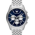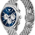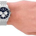 Мужские часы Emporio Armani Antonio AR11582 - стильные с кварцевым механизмом сочетают в себе элегантность и функциональность, что делает их идеальным аксессуаром для современного мужчины. Корпус часов из нержавеющей стали, что обеспечивает долговечность и устойчивость к внешним воздействиям. Минеральное стеклоМинеральное стеклоМинеральное стекло представляет собой искусственно выращенный минерал кварца. Такое стекло отличается особой устойчивостью к повреждениям и царапинам. Уступает по некоторым качествам сапфировому стеклу. защищает синий циферблат, добавляя изысканности всей конструкции. Размер корпуса составляет 41 мм, что придаёт часам солидный внешний вид, не утяжеляя при этом запястье. Часы имеют водонепроницаемость WR50 (5 атм), это позволяет использовать их в повседневной жизни, не опасаясь воздействия воды. Стальной браслет на застежке «бабочка»Застёжка "бабочка"Такой вид застёжки дополняется предохранителями, помогающими избежать случайного раскрытия браслета. Обладают изящным исполнением. обеспечивает комфортное и надёжное крепление на запястье.  Этот хронографХронографФункция позволяет измерять отрезки времени с особой точностью: часы, минуты, секунды. Верным признаком хронографа является наличие на циферблате 3 дополнительных окошек-счётчиков. с функцией секундомераСекундомерСекундоме́р — прибор, способный измерять интервалы времени с точностью до долей секунды. и календарем, отображающим дату, станет идеальным аксессуаром для тех, кто ценит функциональность и итальянское качество.