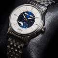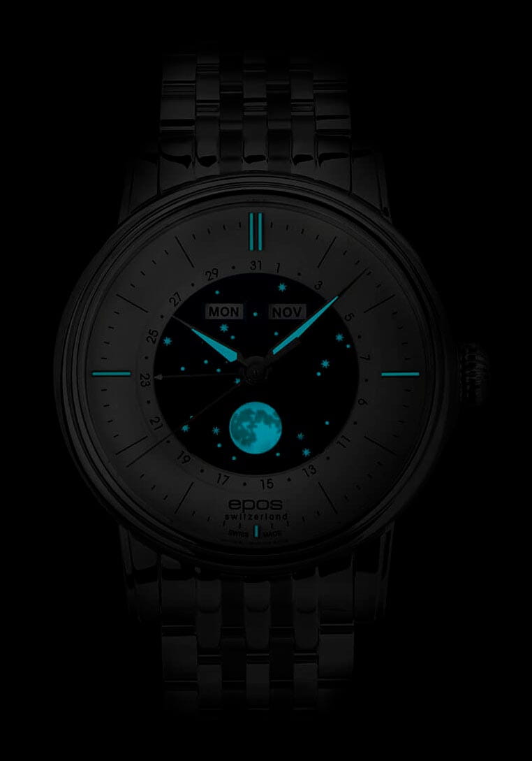 Мужские швейцарские механические часы с автоподзаводом Epos Oeuvre d'art 3439.322.20.18.30. Сапфировое стеклоСапфировое стеклоПрочный и надёжный материал из кристалла сапфира синтетического происхождения, характеризующийся особой твёрдостью и устойчивостью к царапинам и повреждениям. устойчивое к появлению царапин, обладающее высокой прозрачностью. Корпус и браслет часов изготовлен из нержавеющей стали. Стрелки и метки с люминесцентной подсветкойЛюминесцентное покрытиеПозволяет считывать показания времени в темноте. Производители наносят на стрелки, часовые индексы, безель или поверхность циферблата светонакопительный состав, дающий холодное свечение.. В механизме 25 камней, частота 28800 полуколебаний в час. Запас хода 42 часа. Механизм декорирован узором Cotes de Geneve. Циферблат выполнен по технологии Sunray (солнечные лучи). В центре циферблат дополнен изображением ночного неба со светящимися звездами и большой светящейся луной. Накладные метки в виде штрихов. Дата отображается центральной стрелкой. Окошко дня недели и месяца. Автоматический указатель фазы луны. Винтажная заводная головка. Прозрачная задняя крышка. Класс водозащиты: 50 метров, позволит защитить корпус от случайных брызг или капель дождя. Стальной браслет на раскладной застёжкеРаскладная застёжкаТакой тип застёжки используется только на браслетах из металла. Она никогда не раскрывается полностью, происходит разделение на 2 и более частей. Раскладывающая застёжка снизит вероятность потери часов к минимуму..