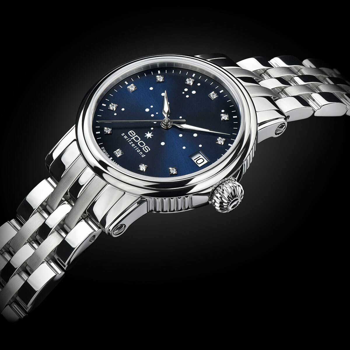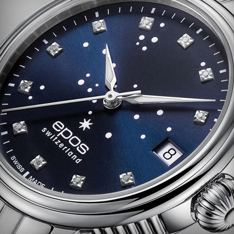 Женские механические часы с автоподзаводом Epos Ladies 4390.152.20.96.30. Сапфировое стеклоСапфировое стеклоПрочный и надёжный материал из кристалла сапфира синтетического происхождения, характеризующийся особой твёрдостью и устойчивостью к царапинам и повреждениям. устойчивое к появлению царапин, обладающее высокой прозрачностью. Корпус и браслет часов изготовлен из нержавеющей стали. В механизме 21 камень, частота 28800 полуколебаний в час. Запас хода 42 часа. Циферблат украшен 11 бриллиантами. Метки в виде точек. Окошко даты находится в положении 3 часа. Часовой механизм декорирован. Прозрачная задняя крышка с минеральным стекломМинеральное стеклоМинеральное стекло представляет собой искусственно выращенный минерал кварца. Такое стекло отличается особой устойчивостью к повреждениям и царапинам. Уступает по некоторым качествам сапфировому стеклу.. Крупная рельефная заводная головка. Водостойкость: 50 метров, позволит защитить корпус от случайных брызг или капель дождя. Стальной браслет на застёжке «бабочка» с кнопкамиЗастёжка "бабочка"Такой вид застёжки дополняется предохранителями, помогающими избежать случайного раскрытия браслета. Обладают изящным исполнением. .