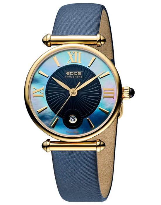 Женские швейцарские наручные часы Epos Quartz, с кварцевым механизмом с высокой точностью. Сапфировое стеклоСапфировое стеклоПрочный и надёжный материал из кристалла сапфира синтетического происхождения, характеризующийся особой твёрдостью и устойчивостью к царапинам и повреждениям. устойчивое к появлению царапин, обладающее высокой прозрачностью. Класс водозащиты: 30 метров, позволит защитить корпус от случайных брызг или капель дождя. Корпус часов изготовлен из стали с PVD-покрытиемPVDУльтратонкое покрытие наносится в технике вакуумного напыления, сочетает в себе нитрид титана особой прочности со слоем золота или оксида хрома. Несёт в себе декоративную или защитную функцию.. Кожаный ремешок с классической застежкой.