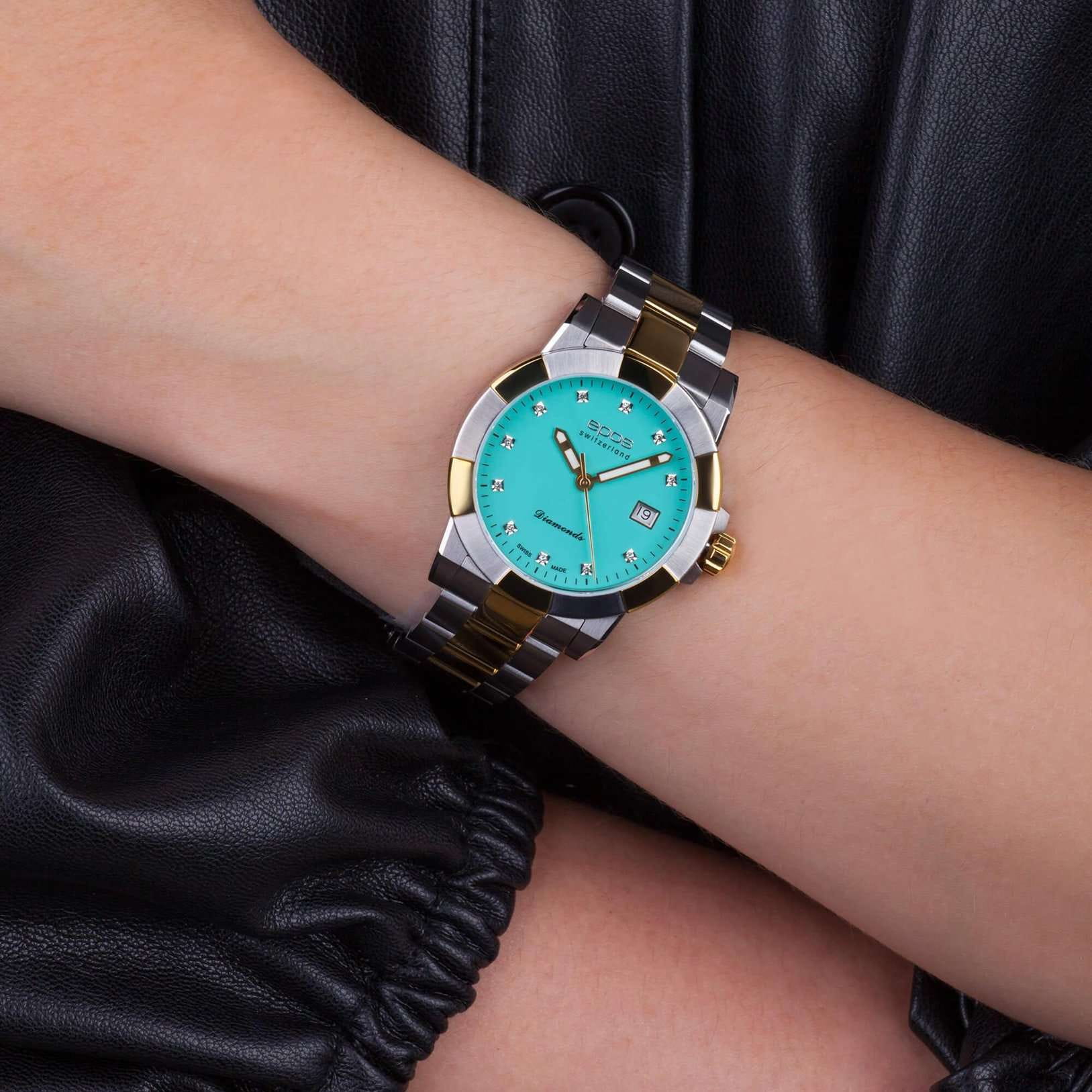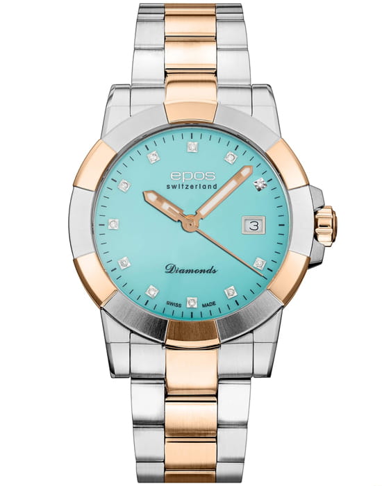 Женские кварцевые часы Epos из коллекции Ladies Diamonds — это элегантный аксессуар, сочетающий швейцарское качество и изысканный дизайн. Корпус диаметром 36 мм и толщиной 9 мм выполнен из нержавеющей стали 316L, безель с частичным PVD-покрытиемPVDУльтратонкое покрытие наносится в технике вакуумного напыления, сочетает в себе нитрид титана особой прочности со слоем золота или оксида хрома. Несёт в себе декоративную или защитную функцию. розового золота. Циферблат с перламутровой вставкой бирюзового оттенка выполнен по технологии «солнечные лучи» и украшен синтетическими бриллиантами. Циферблат защищён сапфировым стекломСапфировое стеклоПрочный и надёжный материал из кристалла сапфира синтетического происхождения, характеризующийся особой твёрдостью и устойчивостью к царапинам и повреждениям.. Метки в виде точек инкрустированы бриллиантами. Стрелки с люминесцентным покрытиемЛюминесцентное покрытиеПозволяет считывать показания времени в темноте. Производители наносят на стрелки, часовые индексы, безель или поверхность циферблата светонакопительный состав, дающий холодное свечение., обеспечивающим хорошую читаемость в темноте. Окошко даты расположено в положении 3 часов. Механизм — швейцарский кварцевый калибр Ronda 705. Часы оснащены стальным браслетом комбинированного цвета на раскладной застёжкеРаскладная застёжкаТакой тип застёжки используется только на браслетах из металла. Она никогда не раскрывается полностью, происходит разделение на 2 и более частей. Раскладывающая застёжка снизит вероятность потери часов к минимуму.. Водонепроницаемость 50 м позволяет использовать часы в повседневных условиях.