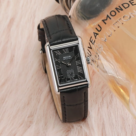 Epos 8002.702.20.25.15 — женская модель с утончённым классическим стилем и прямоугольным корпусом, выполненным из нержавеющей стали. Чёрный циферблат оформлен римскими индексами и утончённым узором «Clous de Paris», создающим игру света и подчёркивающим глубину дизайна. Защитную функцию выполняет сапфировое стеклоСапфировое стеклоПрочный и надёжный материал из кристалла сапфира синтетического происхождения, характеризующийся особой твёрдостью и устойчивостью к царапинам и повреждениям., стойкое к царапинам и сохраняющее прозрачность. В основе лежит швейцарский автоматический механизм, обеспечивающий стабильность и точность хода. Функции включают индикацию часов, минут и малую секундную шкалу, расположенную в позиции «6 часов». Часы дополнены кожаным ремешком классического чёрного цвета, который гармонично завершает строгий образ модели.