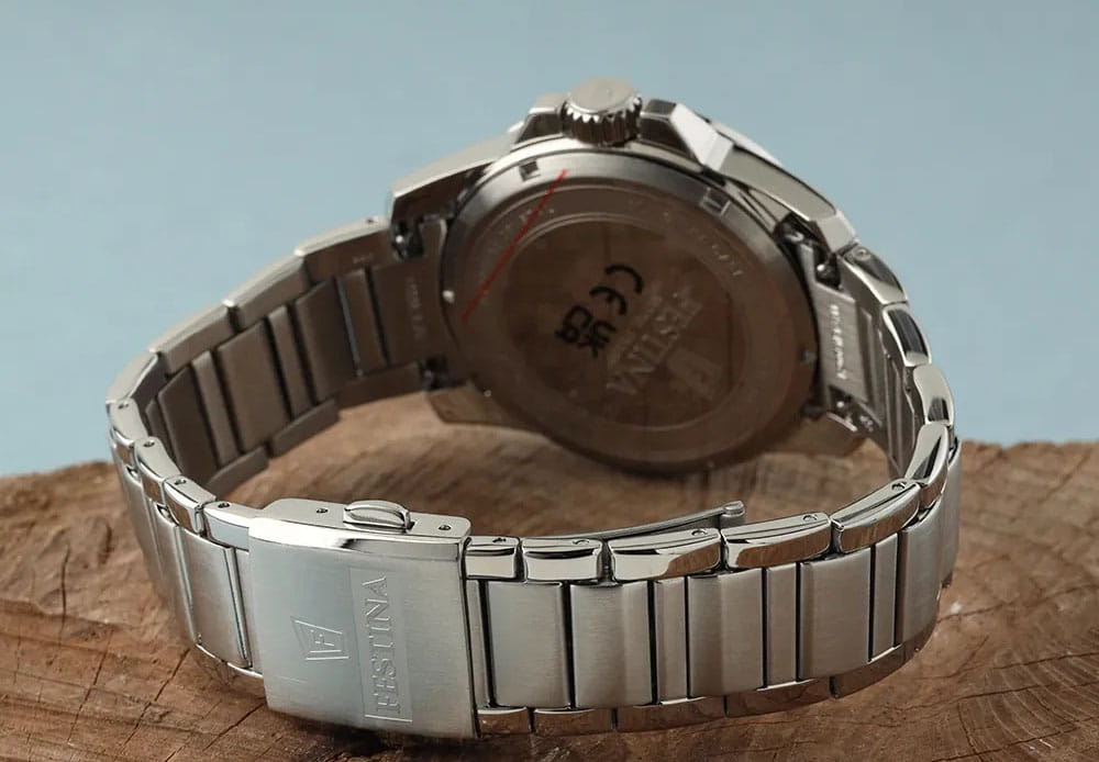 Мужские кварцевые часы Festina F20081/1 из коллекции Swiss Made — это стильный аксессуар с швейцарским качеством и лаконичным дизайном. Корпус диаметром 42 мм и толщиной 11 мм выполнен из нержавеющей стали серебряного цвета. Циферблат бежевого цвета оформлен индексами и дополнен окошком даты в положении 3 часов. Циферблат защищён сапфировым стекломСапфировое стеклоПрочный и надёжный материал из кристалла сапфира синтетического происхождения, характеризующийся особой твёрдостью и устойчивостью к царапинам и повреждениям. с антибликовым покрытиемАнтибликовое покрытиеСлой оксида металла в 0,13-0,3 микрон, благодаря которому стекло часов не бликует и не отражает свет. Антибликовое покрытие уменьшает отражение света в 10 раз, обеспечивая отличную читаемость показателей циферблата.. Стрелки и метки с люминесцентным покрытиемЛюминесцентное покрытиеПозволяет считывать показания времени в темноте. Производители наносят на стрелки, часовые индексы, безель или поверхность циферблата светонакопительный состав, дающий холодное свечение., обеспечивающим хорошую читаемость в темноте. Завинчивающаяся коронка и задняя крышка повышают надёжность конструкции. Часы оснащены стальным браслетом на раскладной застёжкеРаскладная застёжкаТакой тип застёжки используется только на браслетах из металла. Она никогда не раскрывается полностью, происходит разделение на 2 и более частей. Раскладывающая застёжка снизит вероятность потери часов к минимуму. с кнопками. Механизм — кварцевый калибр Ronda 715 с 60-месячным сроком службы батареи. Водонепроницаемость 100 м позволяет использовать часы для плавания. Универсальный выбор для тех, кто ценит точность, надёжность и классический стиль.