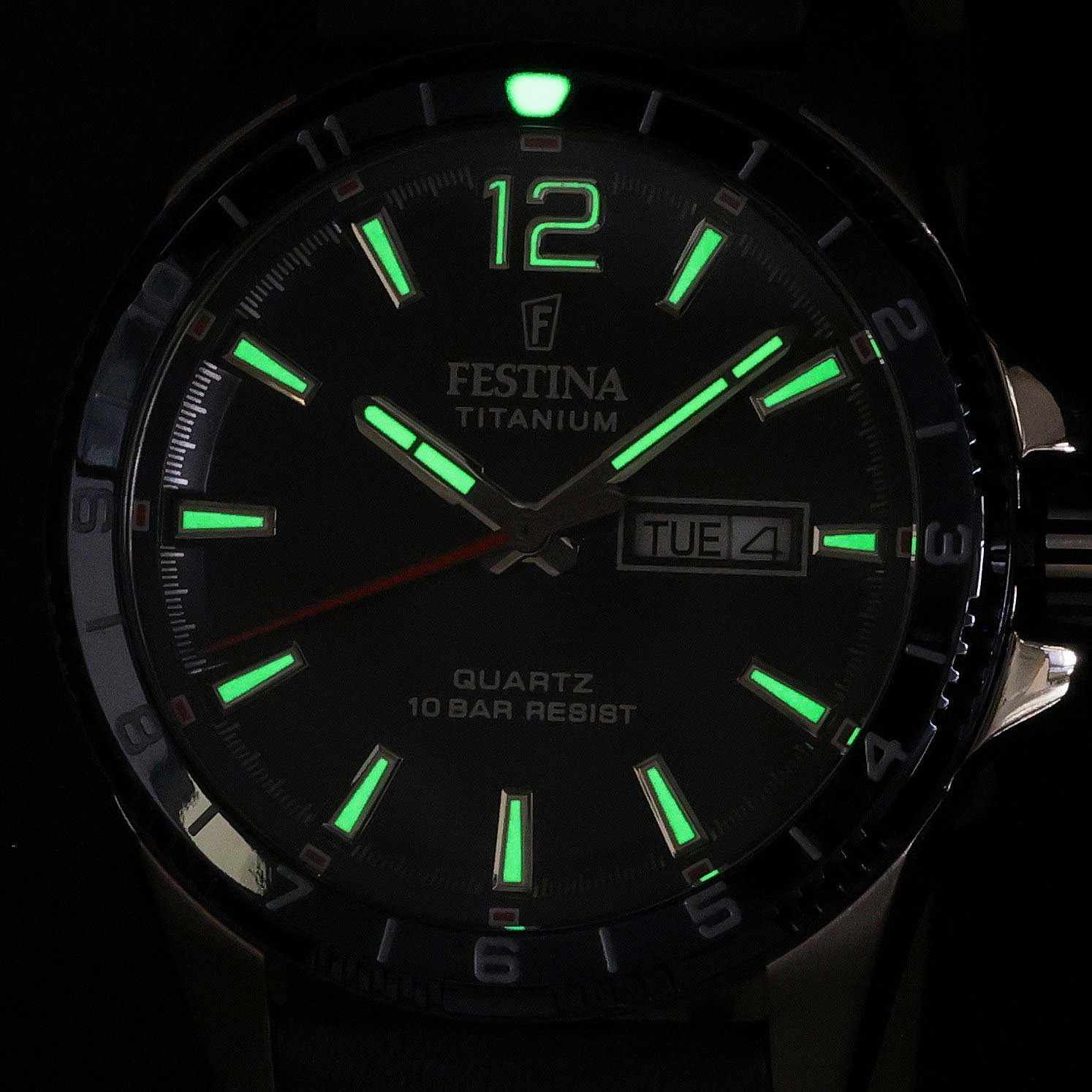 Титановые наручные часы Festina Titanium F20699/2 имеют кварцевый механизм с высокой точностью. Минеральное стеклоМинеральное стеклоМинеральное стекло представляет собой искусственно выращенный минерал кварца. Такое стекло отличается особой устойчивостью к повреждениям и царапинам. Уступает по некоторым качествам сапфировому стеклу. устойчивое к появлению царапин, обладающее высокой прозрачностью, защищает синий циферблат. БезельБезельВнешний ободок, закрепляющий стекло. В спортивных часах так называется поворотное кольцо с делениями на циферблате, выполняет роль таймера – замеряет отрезки времени на шкале. Неподвижный безель – элемент декора. Однонаправленно вращающийся безель на дайверских часах позволяет фиксировать моменты погружения и выныривания на поверхность. с часовыми метками выполнен из нержавеющей стали с синим PVDPVDУльтратонкое покрытие наносится в технике вакуумного напыления, сочетает в себе нитрид титана особой прочности со слоем золота или оксида хрома. Несёт в себе декоративную или защитную функцию. покрытием. Класс водозащиты: 100 метров, позволит плавать, нырять и заниматься другими водными видами спорта. Корпус часов изготовлен из титана, перфорированный ремешок синего цвета из натуральной кожи с классической застежкой. Люминесцентное покрытиеЛюминесцентное покрытиеПозволяет считывать показания времени в темноте. Производители наносят на стрелки, часовые индексы, безель или поверхность циферблата светонакопительный состав, дающий холодное свечение. на стрелках и метках обеспечивает отличную видимость в темноте, а окошко даты с днем недели, расположенное в позиции 3 часа, добавляет практичности.