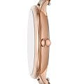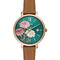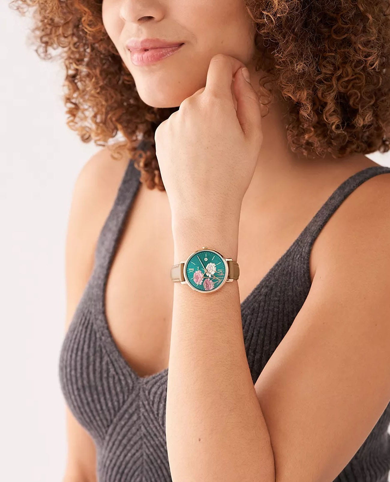 Женские американские часы с минеральным стекломМинеральное стеклоМинеральное стекло представляет собой искусственно выращенный минерал кварца. Такое стекло отличается особой устойчивостью к повреждениям и царапинам. Уступает по некоторым качествам сапфировому стеклу. Fossil Jacqueline ES5274, кварцевый механизм с высокой точностью. Корпус часов изготовлен из нержавеющей стали с IP-покрытиемIP-покрытиеМетод ионного напыления. Демонстрирует повышенную устойчивость к истиранию, окислению и химическим веществам. Под воздействием высокого давления и температуры около 1500°C молекулы металла надёжно соединяются с частицами корпуса часов.. Циферблат украшен объемным изображением цветов. Окошко даты в положении 3 часов. Метки в виде штрихов и двух римских цифр. Рифленая заводная головка с защитой. Класс водозащиты: 30 метров, позволит защитить корпус от случайных брызг или капель дождя. Кожаный ремешок на стандартной застежке.