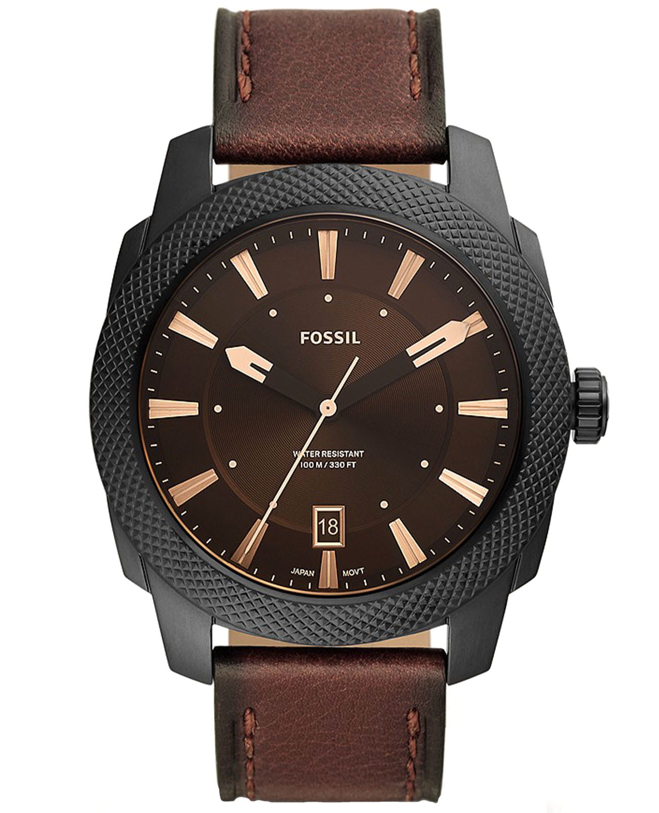 Мужские часы с минеральным стекломМинеральное стеклоМинеральное стекло представляет собой искусственно выращенный минерал кварца. Такое стекло отличается особой устойчивостью к повреждениям и царапинам. Уступает по некоторым качествам сапфировому стеклу. Fossil Machine FS5972, кварцевый механизм с высокой точностью. Минеральное стеклоМинеральное стеклоМинеральное стекло представляет собой искусственно выращенный минерал кварца. Такое стекло отличается особой устойчивостью к повреждениям и царапинам. Уступает по некоторым качествам сапфировому стеклу. устойчивое к мелким механическим повреждениям. Класс водозащиты: 100 метров, позволит плавать, нырять и заниматься другими водными видами спорта. Корпус часов изготовлен из стали с IP-покрытиемIP-покрытиеМетод ионного напыления. Демонстрирует повышенную устойчивость к истиранию, окислению и химическим веществам. Под воздействием высокого давления и температуры около 1500°C молекулы металла надёжно соединяются с частицами корпуса часов.. Кожаный ремешок на стандартной застёжке. Метки в виде штрихов. Окошко даты находится в положении 6 часов.