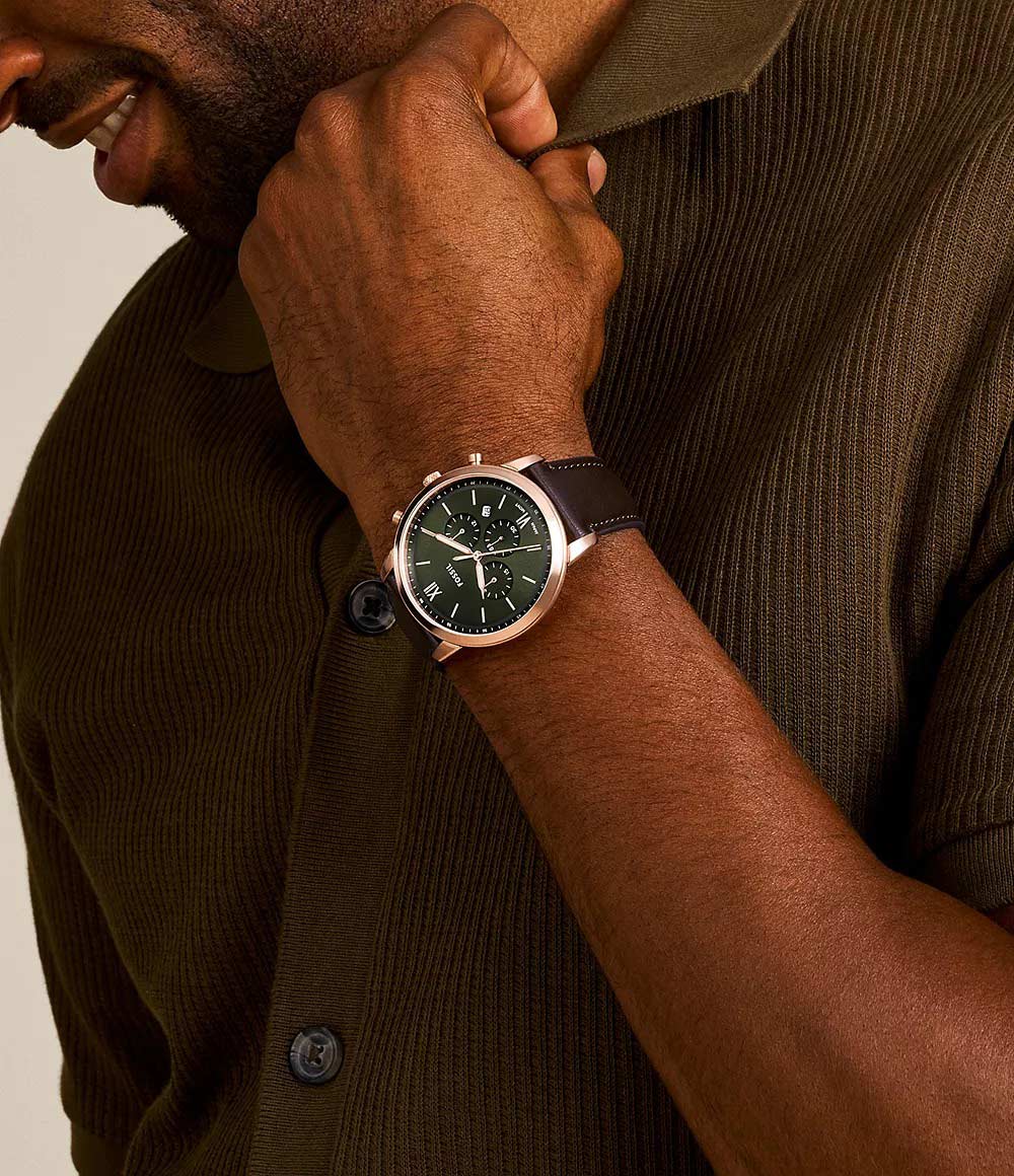 Часы Fossil Neutra FS6073 идеально подойдут для тех, кто ценит классический стиль, дополненный современными деталями, и ищет аксессуар, способный подчеркнуть их индивидуальность и элегантность. Эти мужские наручные часы-хронографХронографФункция позволяет измерять отрезки времени с особой точностью: часы, минуты, секунды. Верным признаком хронографа является наличие на циферблате 3 дополнительных окошек-счётчиков. с секундомеромСекундомерСекундоме́р — прибор, способный измерять интервалы времени с точностью до долей секунды. производятся в США и оснащены надежным кварцевым механизмом, который обеспечивает точность и стабильность в работе. Корпус из нержавеющей стали с IP-покрытиемIP-покрытиеМетод ионного напыления. Демонстрирует повышенную устойчивость к истиранию, окислению и химическим веществам. Под воздействием высокого давления и температуры около 1500°C молекулы металла надёжно соединяются с частицами корпуса часов., диаметром 44 мм гарантирует долговечность и придает часам стильный и современный вид. Циферблат, выполненный по технологии Sunray, создает эффект солнечных лучей, что добавляет глубину и изысканность дизайну. Метки в виде штрихов и римских цифр VI и XII придают циферблату классический акцент, а рифленая заводная головка облегчает настройку времени. Стрелки с люминесцентным покрытиемЛюминесцентное покрытиеПозволяет считывать показания времени в темноте. Производители наносят на стрелки, часовые индексы, безель или поверхность циферблата светонакопительный состав, дающий холодное свечение. позволяют легко считывать время даже в условиях низкой освещенности. Кожаный ремешок на стандартной застёжке обеспечивает комфортное ношение и надежную фиксацию на запястье. Водозащита уровня 50WR защищает механизм от случайных брызг, а минеральное стеклоМинеральное стеклоМинеральное стекло представляет собой искусственно выращенный минерал кварца. Такое стекло отличается особой устойчивостью к повреждениям и царапинам. Уступает по некоторым качествам сапфировому стеклу. оберегает циферблат от царапин и повреждений. 12-ти и 24-х часовой формат времени.
