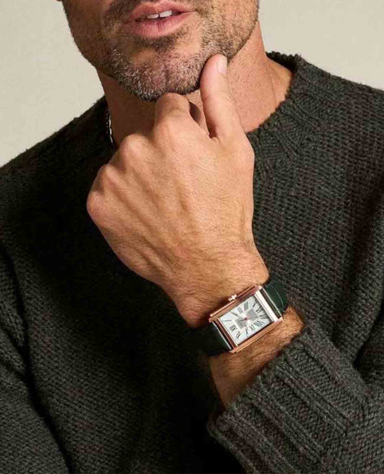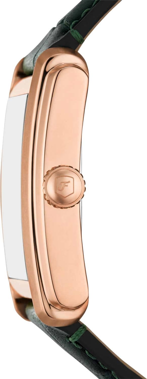 Часы Fossil FS6077 идеально подойдут для тех, кто ценит классический стиль, дополненный современными деталями, и ищет аксессуар, способный подчеркнуть их индивидуальность и элегантность. Эти мужские наручные часы производятся в США и оснащены надежным кварцевым механизмом, который обеспечивает точность и стабильность в работе. Прямоугольный корпус из стали с розово-золотистым IP-покрытиемIP-покрытиеМетод ионного напыления. Демонстрирует повышенную устойчивость к истиранию, окислению и химическим веществам. Под воздействием высокого давления и температуры около 1500°C молекулы металла надёжно соединяются с частицами корпуса часов. гарантирует долговечность и придает часам стильный и современный вид. Серебристый циферблат, выполненный по технологии Sunray, создает эффект солнечных лучей, что добавляет глубину и изысканность дизайну. Метки в виде римских цифр придают циферблату классический акцент, а рифленая заводная головка облегчает настройку времени. Стрелки с люминесцентным покрытиемЛюминесцентное покрытиеПозволяет считывать показания времени в темноте. Производители наносят на стрелки, часовые индексы, безель или поверхность циферблата светонакопительный состав, дающий холодное свечение. позволяют легко считывать время даже в условиях низкой освещенности. Часы оснащены удобным кожаным зеленым ремешком с классической застежкой, который обеспечивает комфортное ношение и надежную фиксацию на запястье. Ширина ремешка составляет 22 мм, а длина — 200 мм, что делает их подходящими для большинства запястий. Водозащита уровня 50WR защищает механизм от случайных брызг, а минеральное стеклоМинеральное стеклоМинеральное стекло представляет собой искусственно выращенный минерал кварца. Такое стекло отличается особой устойчивостью к повреждениям и царапинам. Уступает по некоторым качествам сапфировому стеклу. оберегает циферблат от царапин и повреждений.
