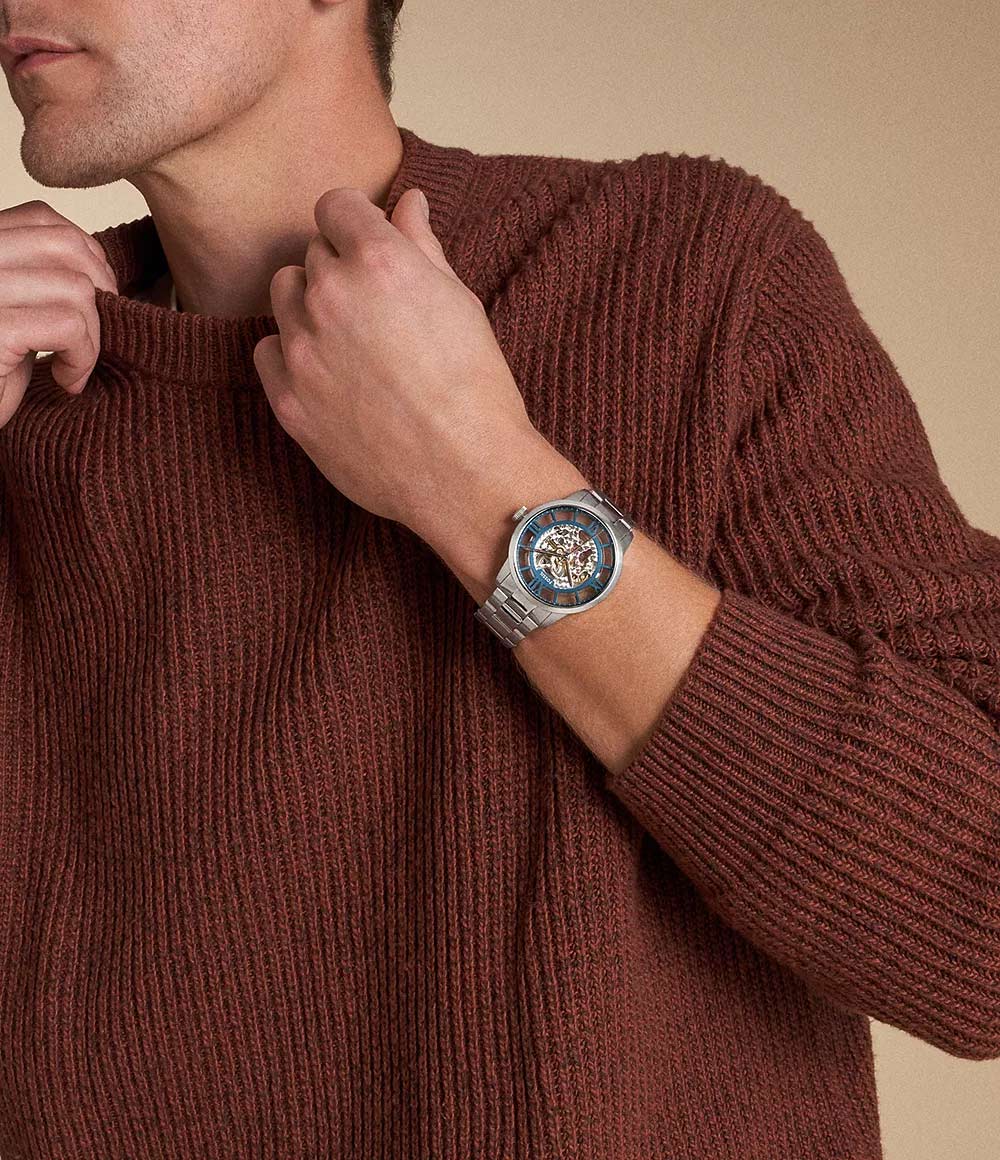 Мужские механические часы-скелетоны с минеральным стекломМинеральное стеклоМинеральное стекло представляет собой искусственно выращенный минерал кварца. Такое стекло отличается особой устойчивостью к повреждениям и царапинам. Уступает по некоторым качествам сапфировому стеклу. Fossil Townsman ME3260, механический механизм (автоматический калибр) с высокой точностью. Класс водозащиты: 50 метров, позволит защитить корпус от случайных брызг или капель дождя. Корпус часов изготовлен из стали с IP-покрытиемIP-покрытиеМетод ионного напыления. Демонстрирует повышенную устойчивость к истиранию, окислению и химическим веществам. Под воздействием высокого давления и температуры около 1500°C молекулы металла надёжно соединяются с частицами корпуса часов.. Метки выполнены в виде римских цифр. Рифленая заводная головка расположена с правой стороны корпуса. Циферблат в виде скелета с бронзовыми элементами. Стальной браслет на раскладной застёжкеРаскладная застёжкаТакой тип застёжки используется только на браслетах из металла. Она никогда не раскрывается полностью, происходит разделение на 2 и более частей. Раскладывающая застёжка снизит вероятность потери часов к минимуму..