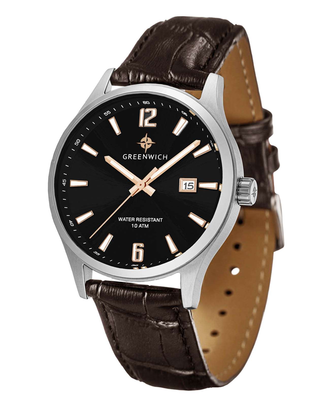 Мужские часы Greenwich Octopus GW 051.12.30, кварцевый механизм с высокой точностью. Минеральное стеклоМинеральное стеклоМинеральное стекло представляет собой искусственно выращенный минерал кварца. Такое стекло отличается особой устойчивостью к повреждениям и царапинам. Уступает по некоторым качествам сапфировому стеклу. устойчивое к появлению царапин, обладающее высокой прозрачностью. Корпус изготовлен из нержавеющей стали. Окошко даты находится в положении 3 часа. Стрелки с люминесцентным покрытиемЛюминесцентное покрытиеПозволяет считывать показания времени в темноте. Производители наносят на стрелки, часовые индексы, безель или поверхность циферблата светонакопительный состав, дающий холодное свечение.. Класс водозащиты: 100 метров, позволит плавать, нырять и заниматься другими водными видами спорта. Кожаный ремешок на стандартной застежке.